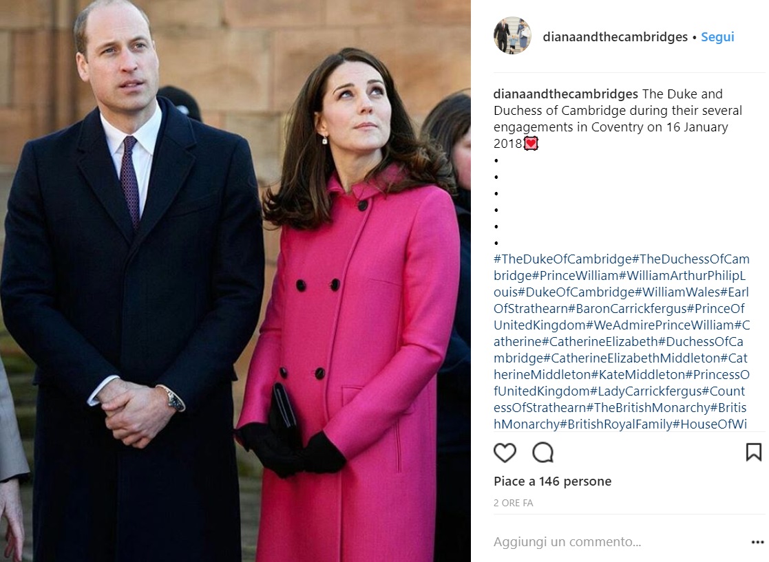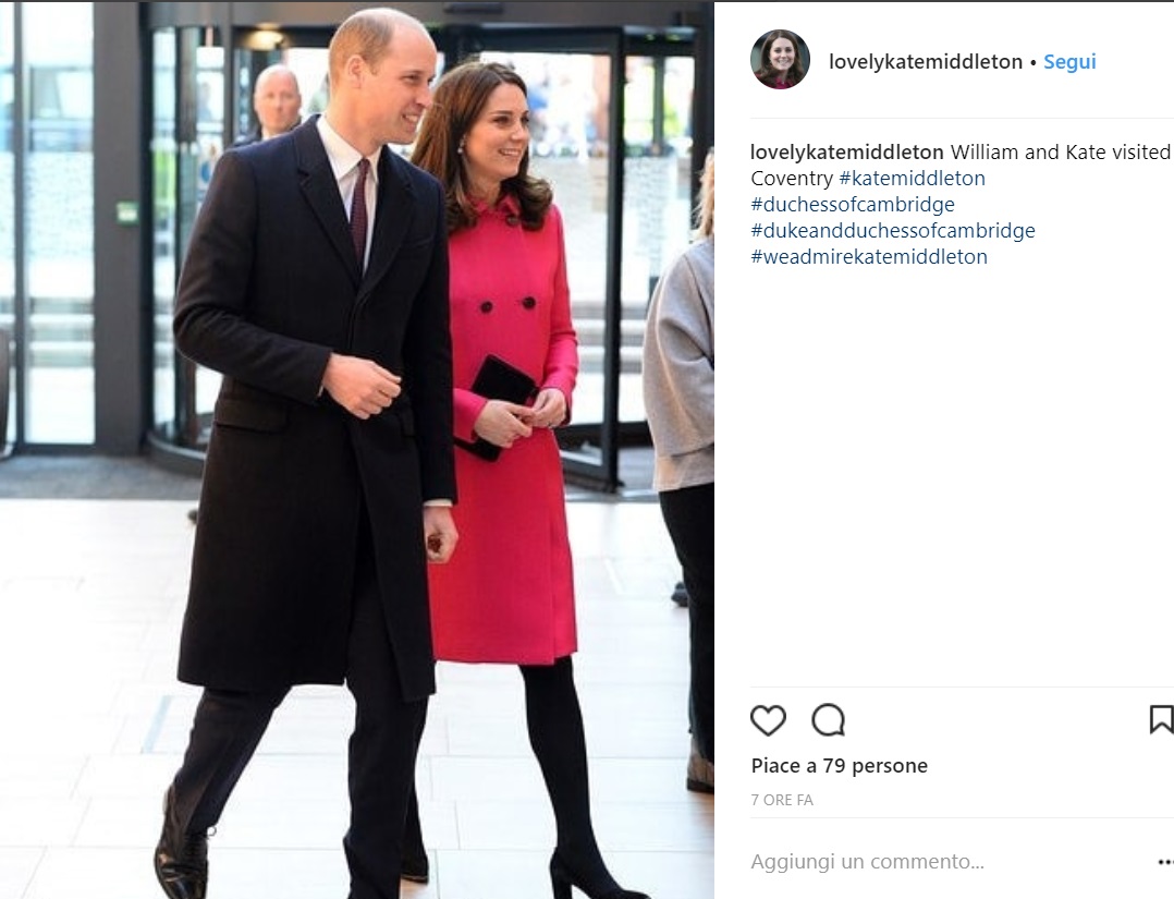 Coventry è la nona città più grande d’Inghilterra, situata a circa 90 minuti a nord-ovest di Londra nelle Midlands inglesi. La città è stata vittima di un bombardamento durante la Seconda Guerra Mondiale, da parte della Luftwaffe tedesca avvenuto nella notte tra il 14 e il 15 novembre 1940 e che è ricordato come uno degli eventi più tragici della guerra. La Cattedrale di Coventry è una delle cattedrali inglesi più recenti, essendo stata ricostruita dopo la distruzione dell’antica chiesa del XIV secolo, dedicata a San Michele, durante quel terribile bombardamento. Kate e William hanno poi raggiunto la Coventry University. Il personale ha accolto i duchi di Windsor con un balletto e Kate, nonostante la gravidanza inoltrata, ha anche accennato un passo di danza.