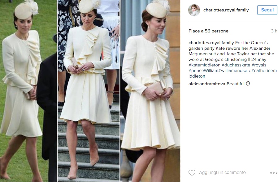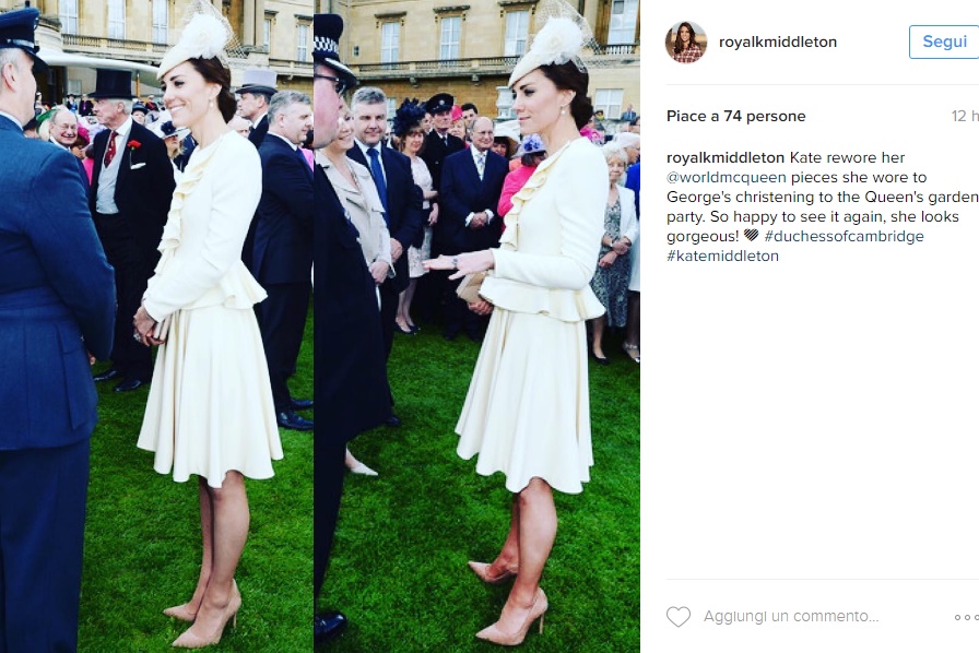 LONDRA – Kate Middleton, look in bianco Alexander McQueen riciclato FOTO. Total white per la nostra amata Kate che, in occasione del party in giardino organizzato per il 90esimo compleanno della Regina Elisabetta, ha scelto un look in bianco firmato Alexander McQueen e completato con il cappellino firmato Jane Taylor. Che dire, come al solito la Duchessa appare bellissima e chic e mai stucchevole. L’abito, tra l’altro, è un sapiente riciclo: questo look è stato già scelto dalla Duchessa in occasione del battesimo del piccolo George nel 2013.