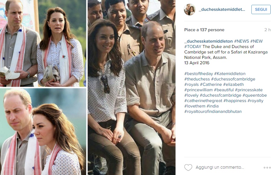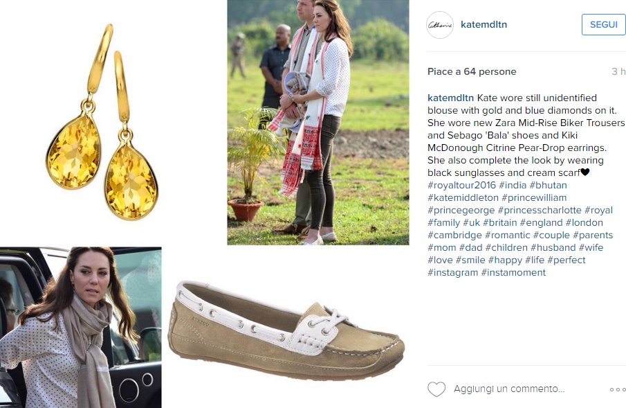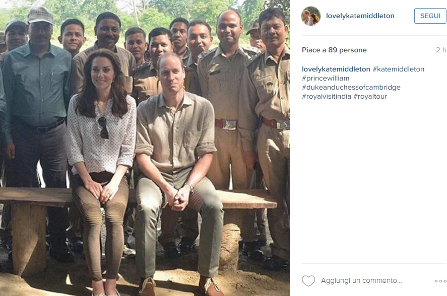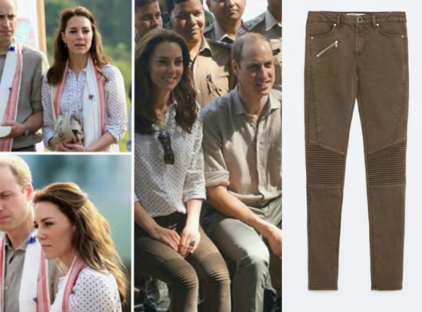 Aprile 2016, viaggio istituzionale in India insieme al marito William. In occasione di un Safari, la Duchessa ha sfoggiato una meravigliosa mise casual.: pantaloni low-cost Zara, blusa a pois e mocassini.Aprile 2016, viaggio istituzionale in India insieme al marito William. In occasione di un Safari, la Duchessa ha sfoggiato una meravigliosa mise casual.: pantaloni low-cost Zara, blusa a pois e mocassini.