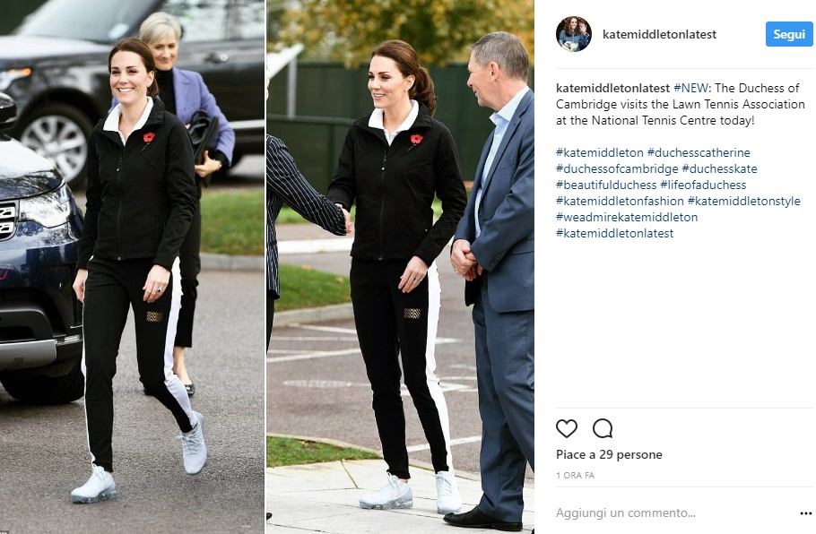 LONDRA – Kate Middleton look sportivo in gravidanza: tuta e Nike FOTO. Con o senza tacchi, Kate Middleton è sempre bellissima e il suo ultimo look sfoggiato lo dimostra. La Duchessa oggi ha presenziato al National Tennis Centre in quanto madrina della Lawn Tennis Association (LTA). Per l’occasione ha sfoggiato un outfit sportivo riuscendo ad apparire ugualmente bellissima e super chic. Kate ha scelto un paio di pantaloni sportivi firmati Monreal London, molto diffusi tra le celebrity (compresa la sorellina Pippa che adora indossare questo marchio), giacca sportiva e scarpe Nike ai piedi.