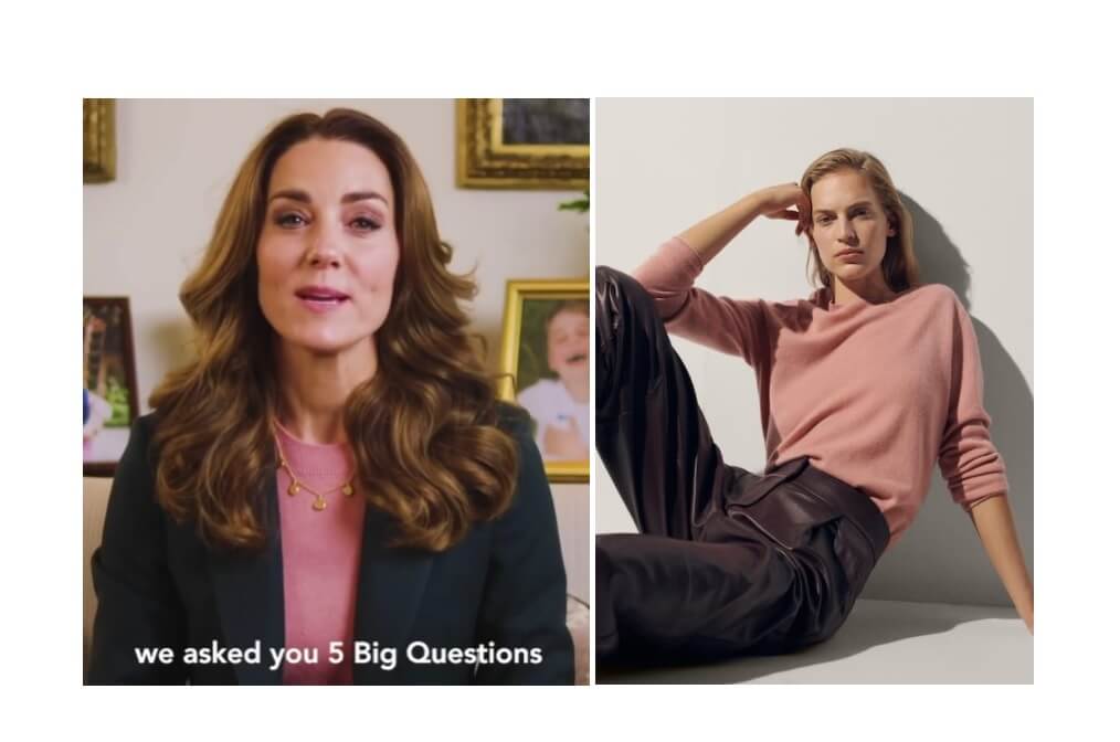 Per l’occasione Kate ha indossato un maglione rosa cipria in cashmere firmato Massimo Dutti, abbinato a un blazer blu scuro e pantaloni dello stesso colore.