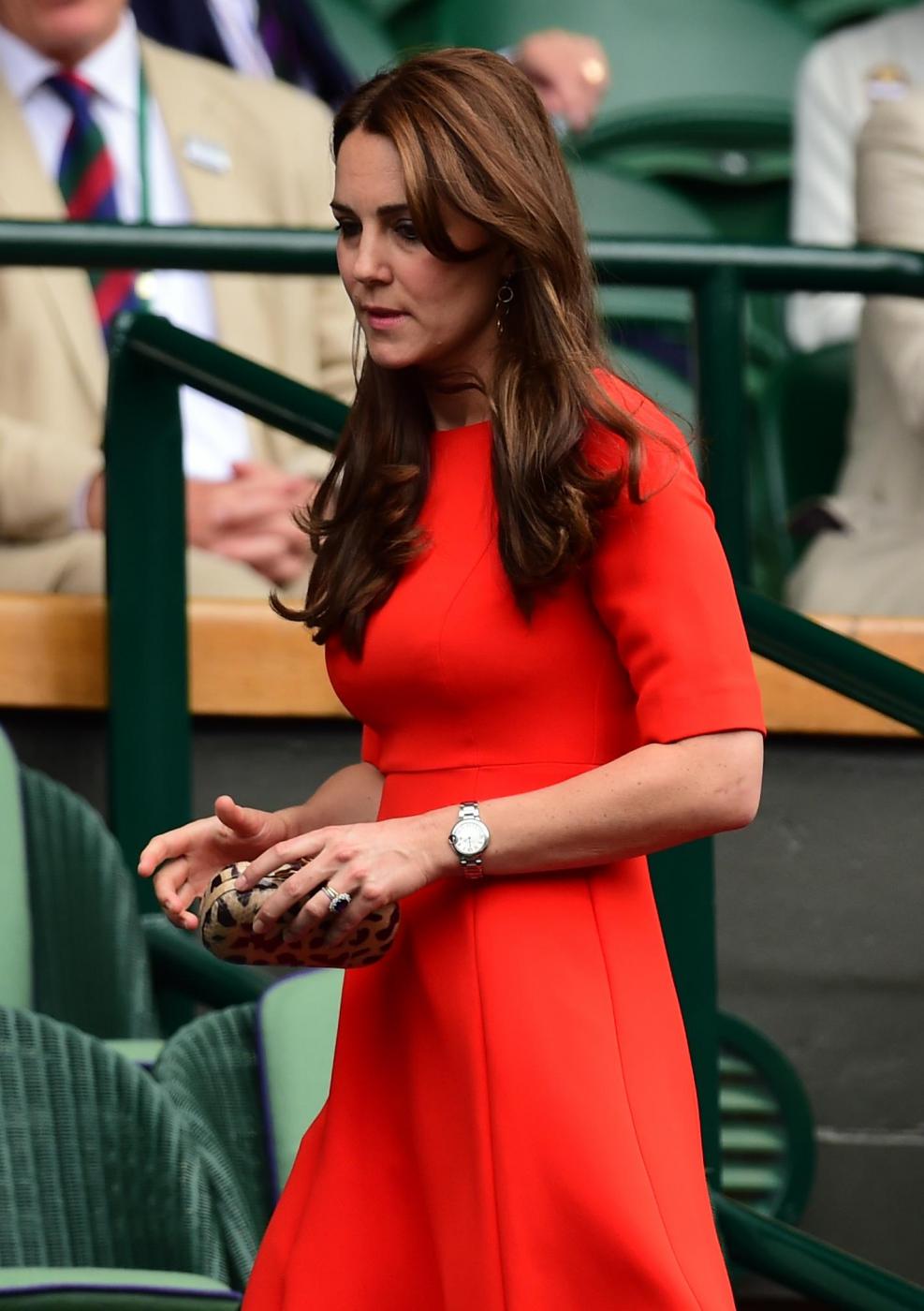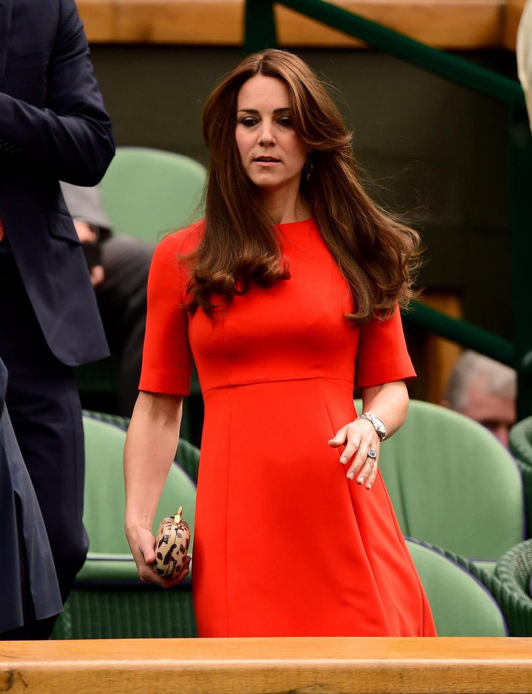 The Duchess of Cambridge in the Royal Box on day Nine of the Wimbledon Championships at the All England Lawn Tennis and Croquet Club, Wimbledon. PRESS ASSOCIATION Photo. Picture date: Wednesday July 8, 2015. See PA Story TENNIS Wimbledon. Photo credit should read: Dominic Lipinski/PA Wire. RESTRICTIONS: Editorial use only. No commercial use without prior written consent of the AELTC. Still image use only - no moving images to emulate broadcast. No superimposing or removal of sponsor/ad logos. Call +44 (0)1158 447447 for further information.
