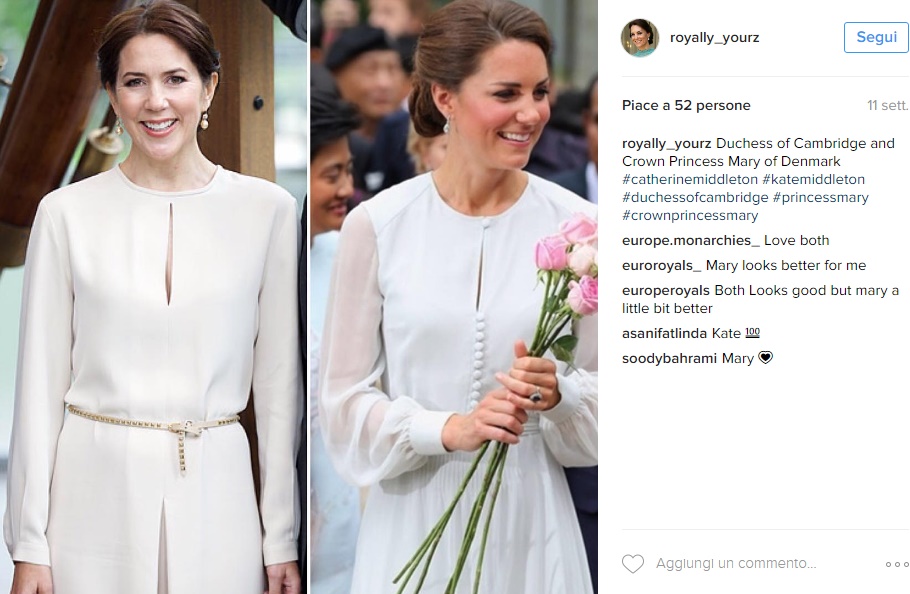 Non solo: spesso le due principesse indossano abiti simili se non uguali, così che la somiglianza traspare ancora di più. Ma chi copia chi? Kate Middleton, si sa, non ha bisogno di presentazioni. Da quando è diventata moglie del principe William ha avuto un’ escalation di popolarità. Bella, discreta, sempre elegante e chic: in poco tempo è entrata nei cuori del popolo inglese. I suoi look sono sempre una garanzia e non c’è una volta che uno o l’altro abito scelto dalla Duchessa non vada poi a ruba tra le ragazze inglesi e non solo. La principessa Mary di Danimarca, invece, forse è meno famosa di Kate ma si sta prendendo uno spazio sempre più ampio nell’Olimpo delle regine più eleganti del mondo.
