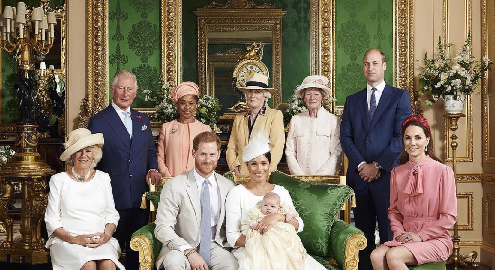 Massimo riserbo anche sui padrini e sui presenti alla cerimonia. Assente la regina Elisabetta: sarebbe stata impegnata in un altro evento fissato in precedenza, si legge sulla stampa locale, alcuni la danno nella tenuta di Sandringham con il principe Filippo. C’erano però le sorelle della principessa Diana, come testimoniato dalla ‘foto di famiglia’ scattata nella Green Drawing Room del castello, che ritrae, attorno a Meghan con in braccio Archie, e ad Harry, i nonni del royal baby: Carlo e Camilla insieme con Doria Ragland, la madre di Meghan. Quindi le sorelle di Diana, Lady Sarah McCorquodale e Lady Jane Fellowes, oltre a William e Kate.