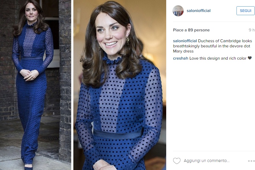 In questa occasione però, con questo meraviglioso abito blu elettrico, la Duchessa riesce ad apparire incredibilmente elegante e semplice allo stesso tempo. Scarpe con il tacco firmate Rupert Sanderson e orecchini dorati completano il look, assolutamente irresistibile. Non è la prima volta che Kate sceglie un abito firmato Saloni Lodha. Già a novembre 2015 la Duchessa ha indossato un abitino da cocktail del marchio londinese in occasione della serata di consegna dei tradizionali premi del Fostering Network. IN quel caso l’abito era ancora di colore blu ma decisamente più casual, corto fino al ginocchio e con una cintina in vita a valorizzare il suo vitino da vespa. Che dire, Kate è sempre splendida.