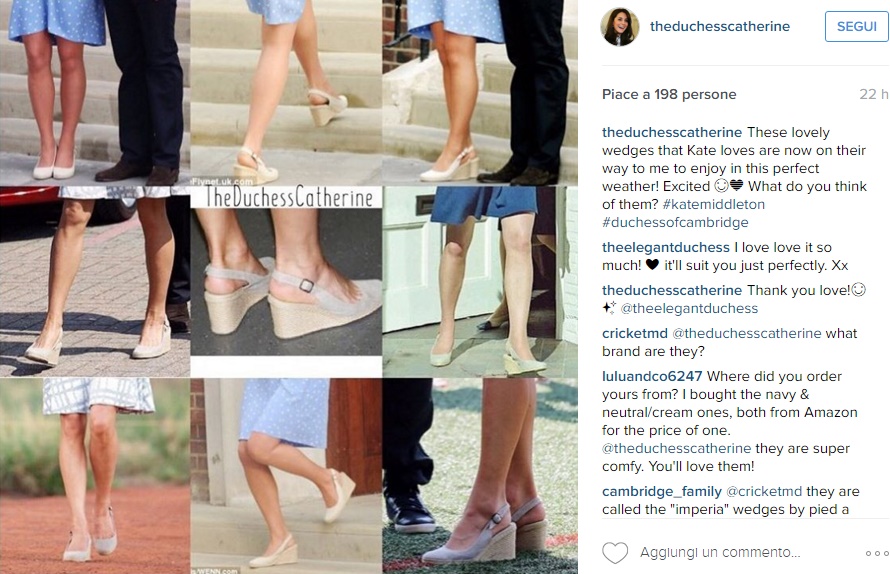 Che Kate Middleton sia una delle principesse più amate e ammirate del pianeta è ormai cosa nota. Non vi è un solo look della Duchessa che passi inosservato e qualsiasi sua mise sfoggiata viene immediatamente copiata da migliaia di ragazze in tutto il mondo. E la cosa sorprendente è che Kate non appare perfetta solo quando è sapientemente in tiro, in occasione di eventi pubblici. Pur nella sua incredibile semplicità, la Duchessa riesce ad essere chic e trendy anche in abiti casual. Anzi, in molti sostengono che proprio in versione casual la moglie di William dia il meglio di sé, tanto che basta un jeans e una t-shirt a righine perché le ragazze inglesi corrano immediatamente nello store low-cost più vicino ad acquistare un jeans e una t-shirt simile. Di seguito, alcune foto di Kate Middleton con il modello di zeppa più amato. Foto INSTAGRAM.