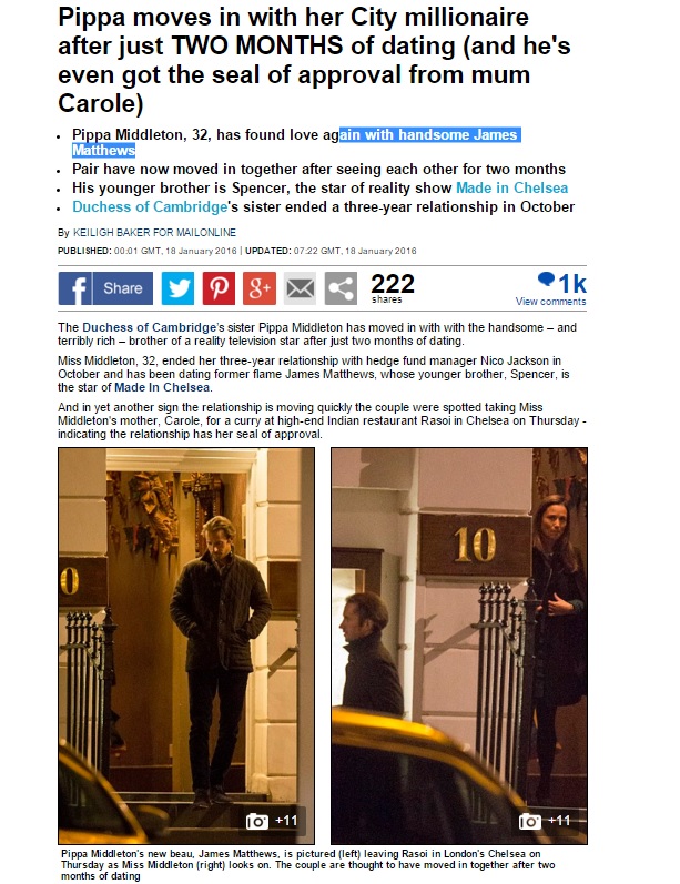 A riprova di questa repentina convivenza tra Pippa e James, il Daily Mail pubblica anche delle foto che mostrano Pippa entrare ed uscire spesso da casa di James. Insomma, sembra proprio che la loro prima vacanza nell’isloa caraibica di Saint Barts in occasione del Capodanno sia andata a meraviglia, tanto che ora i due avrebbero deciso di convivere insieme nella casa a Chelsea di James, dal valore di 17 milioni di sterline.