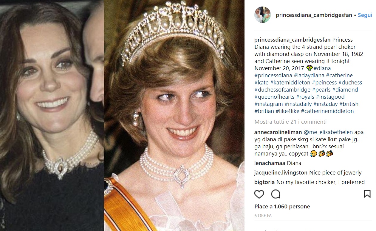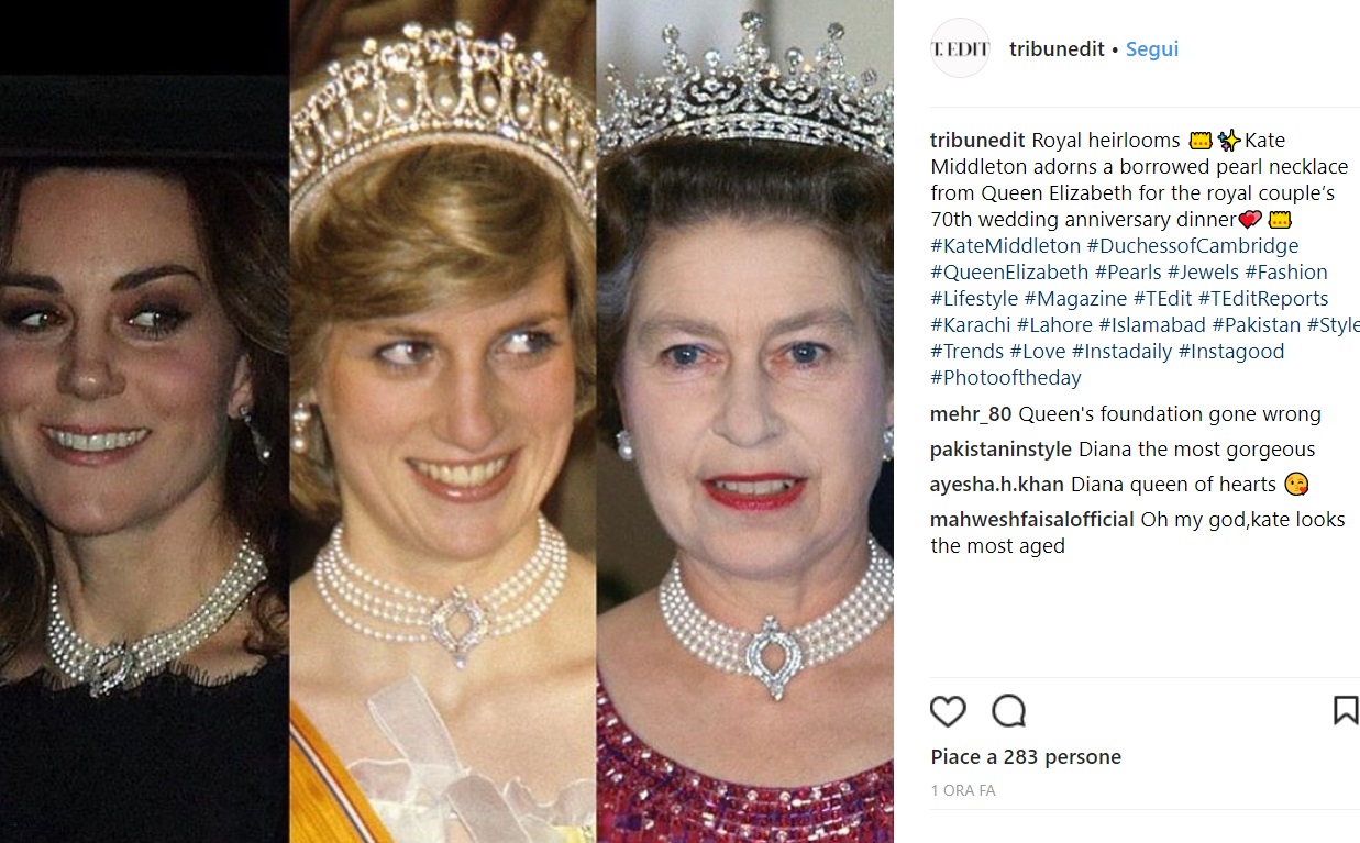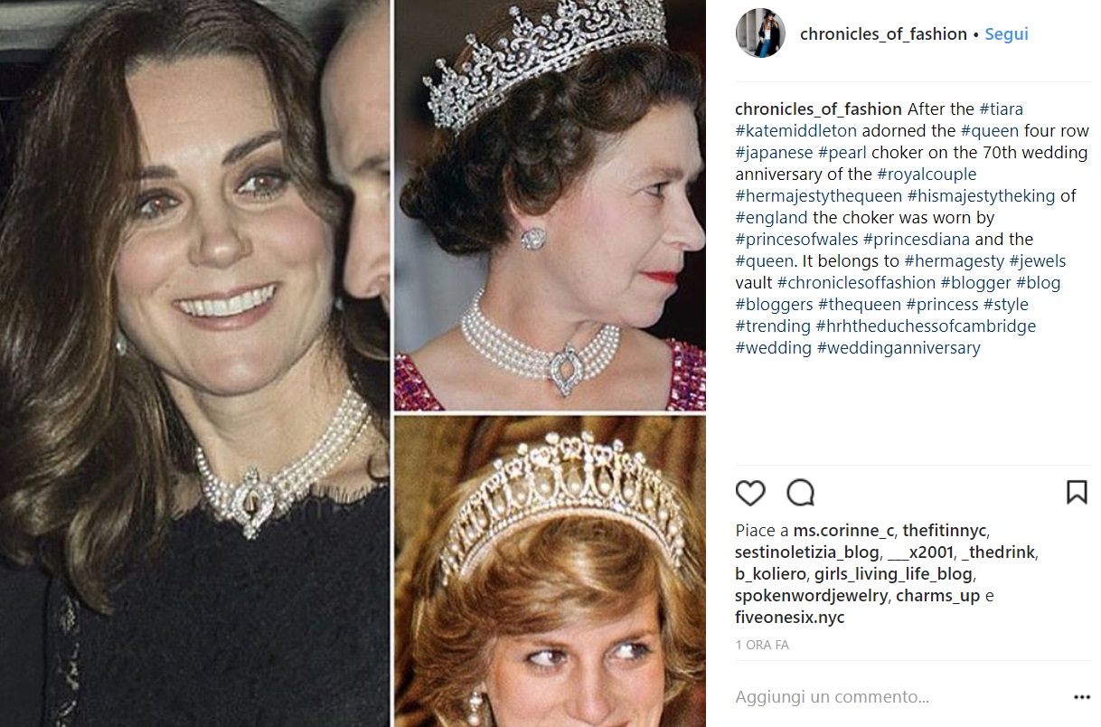 Si tratta di una collana di perle molto importante non solo per il valore economico ma soprattutto simbolico. La collana, infatti, appartiene ai gioielli della regina Elisabetta ed era stata indossata da giovane prima dalla Sovrana e poi da Lady Diana. Un omaggio, dunque, verso la mamma di William. Un modo per far sapere a tutti che Lady Diana era lì con loro, in una sera di festa e allegria.