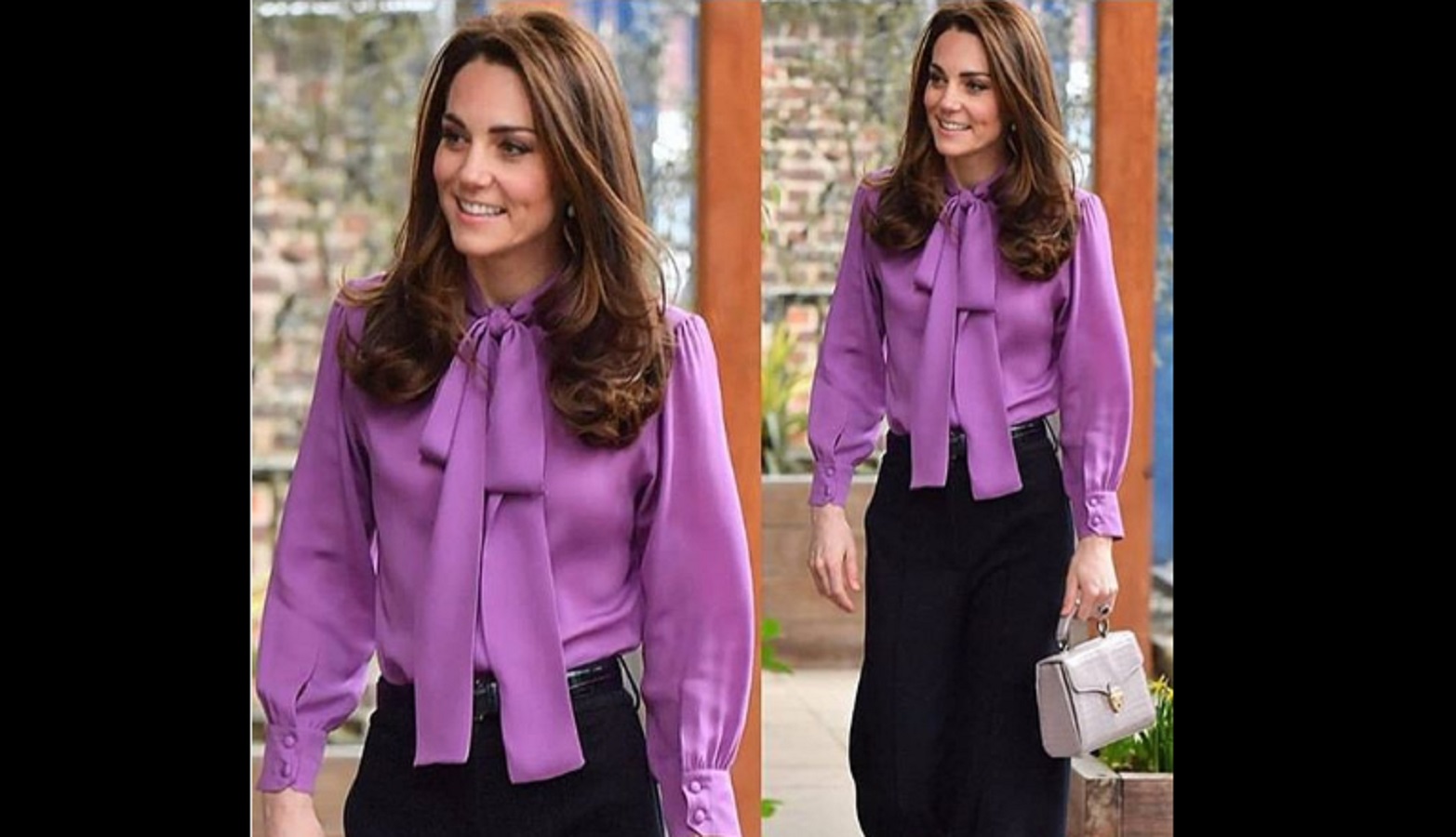 LONDRA – Look inedito per Kate Middleton: in occasione della sua visita al centro per bambini Henry Fawcett di Londra, la Duchessa ha sfoggiato una mise inusuale per i suoi standard ma incredibilmente chic: pantalone a palazzo e lunghissimo (molto Victoria Beckham style) a vita alta, cintura in vita e camicia viola con fiocco sul colletto. Si tratta di un total look firmato Gucci che dona a Kate Middleton un’aria elegante, chic ma anche casual, perfetta per l’occasione.