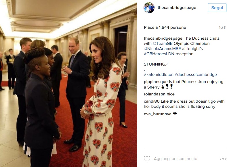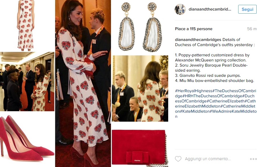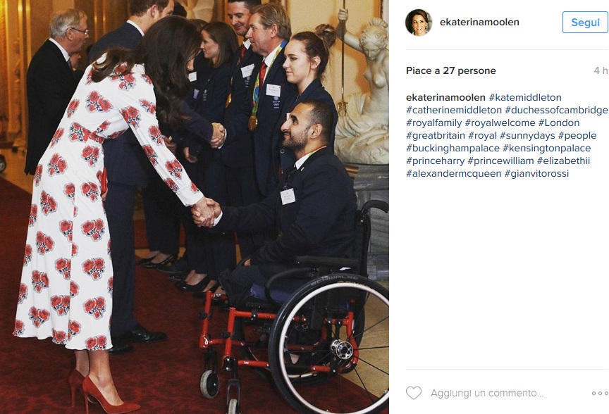 A quanto pare però Kate è recidiva: in occasione dell’incontro a Buckingham Palace con gli atleti olimpici e paralimpici del team della Gran Bretagna, la Duchessa ha scelto un vestito con grossi papaveri rossi disegnati sulla seta impalpabile. Un abito firmato Alexander McQueen che nella versione vista in passerella era valorizzato da uno spacco dietro la schiena e reso glamour da scarpe audaci con plateau. Su Kate Middleton, però, il tocco glamour è sparito: via lo spacco sulla schiena e via alle scarpe fashion, dell’abito è rimasto solo una vestaglietta che fa tanto vecchia zia. Le decolleté in suede rosse, questa volta, non hanno fatto centro così come l’intero look della Duchessa che è apparsa terribilmente… nonna in vestaglia da casa. Kate, basta fiori sui vestiti per favore.
