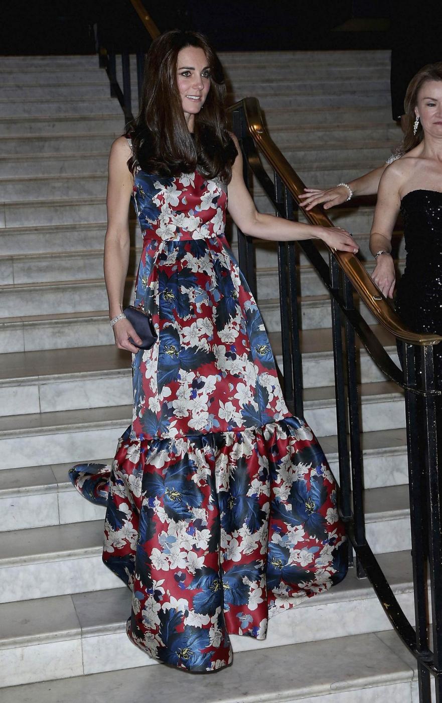 Un abito ceruleo di Jenny Packham, a maniche lunghe, leggermente trasparente e maliziosamente aperto sulla schiena. Schiena, e voler essere molto maliziosi, sulla quale non c’era traccia di reggiseno. Niente male per una futura regina. E martedì sera ecco che Kate esce ancora. Stavolta i capelli sono sciolti, in un’improbabile acconciatura vaporosa a boccoli e frangettona. Un look un po’ anni ’70 che si abbinava all’abito a stampa floreale con ruches sulla gonna. Molto Seventies. Non molto riuscito come look. (Foto Lapresse).