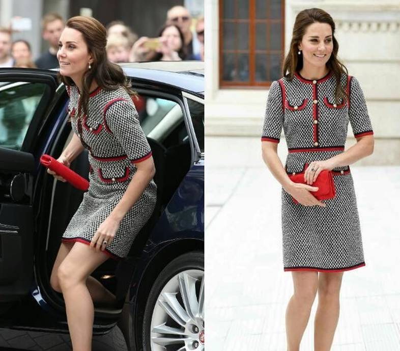 In questo caso, invece, Kate ha scelto un abbigliamento semplice e chic e la gonna, pur essendo corta, non rende la mise volgare perché la Duchessa l’ha sapientemente abbinata a delle decolleté fini ed eleganti. Orecchini di perle e cluth rossa completavano la mise.