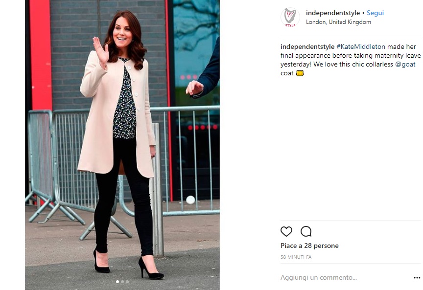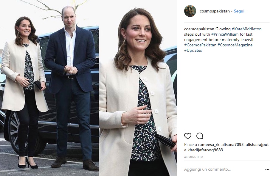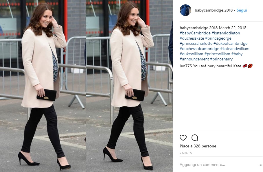 Per l’occasione la Duchessa è apparsa super glamour con un completo casual chic che ha catalizzato l’attenzione di pubblico e fotografi. Kate ha mixato capi nuovi ad altri già indossati e il risultato è stato top: cappotto bianco Goat, blusa con stampe a fiorellini Hobbs London (che è andata sold-out sul sito in pochissime ore). Singolare la scelta del jeans nero, ultra skinny, che dimostra ancora una volta come il gusto e lo stile di Kate non cambi nemmeno quando è incinta all’ottavo mese. Dopotutto la Duchessa è riuscita a sdoganare i look casual chic anche in occasione delle precedenti gravidanze, quando i suoi abitini da cocktail non convenzionali hanno conquistato il cuore di migliaia di donne in tutto il mondo.