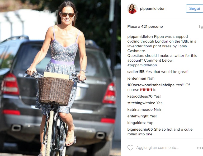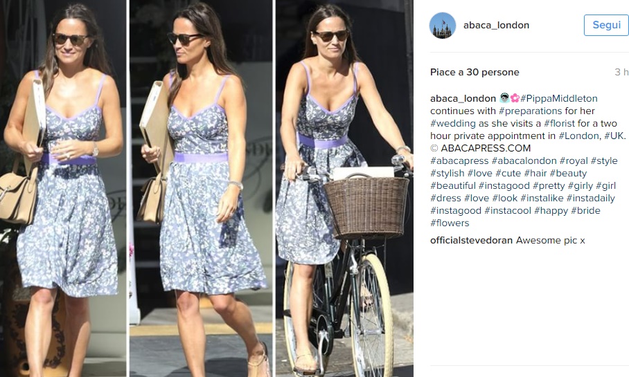 LONDRA – Kate Middleton, sorella Pippa chic: abito scollato in bici FOTO. Completino semplice e chic per Pippa Middleton che, da quando ha annunciato il matrimonio con il fidanzato James Matthews, sta dando davvero il meglio di sé in quanto a look. In giro per Londra alle prese con l’imminente matrimonio (non è stata ancora annunciata la data ma le nozze saranno celebrate probabilmente nel 2017), Pippa ha scelto una mise che non è passata inosservata: approfittando degli ultimi sprazzi di caldo, la sorella minore di Kate ha scelto un abitino floreale dal sapore estivo sui colori del viola. Un abitino firmato Tania Cashmere, scollato e con gonna a pieghe fin sotto il ginocchio, che ha messo in risalto il fisico atletico e slanciato di Pippa. Sandaletto estivo e, visibile a km di distanza, l’ormai inseparabile anello di fidanzamento che le ha regalato il futuro marito James: una meravigliosa creazione di diamanti di ispirazione art decò di 4 carati e del valore di 200 mila sterline. Che dire, la Duchessa di Cambridge deve essere proprio orgogliosa della sorella: entrambe, dopotutto, hanno ereditato da mamma Caroline un innato gusto nel vestire e sia Kate quanto Pippa lo dimostrano giorno per giorno, sfoggiando sempre dei look che mandano in visibilio le fan delle sorelle più famose d’Inghilterra.
