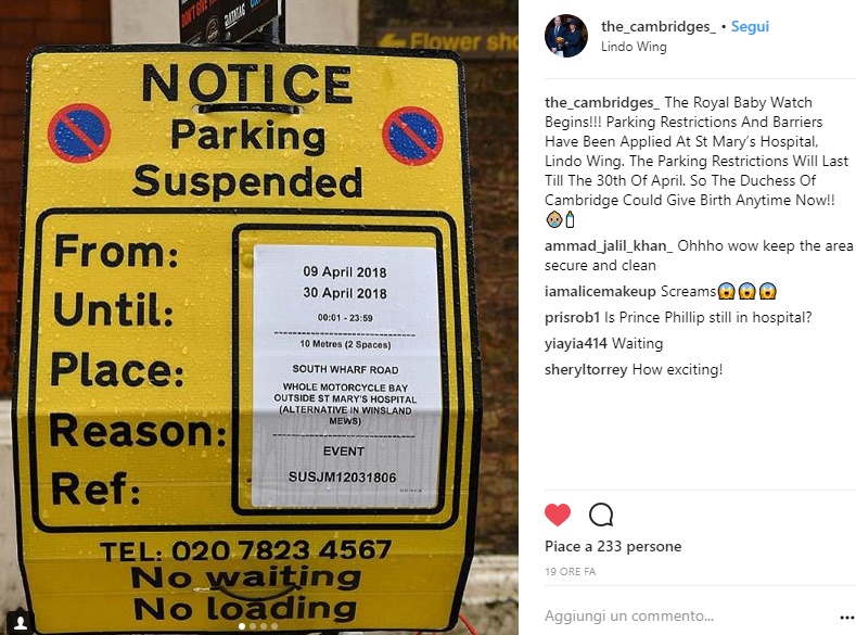 L’affissione di tali cartelli non lascia spazio a dubbi: anche in occasione delle gravidanza di George e Charlotte, infatti, erano stati messi i divieti di sosta poche ore prima del parto. Per questo motivo gli inglesi ne sono certi: Kate partorirà a breve.