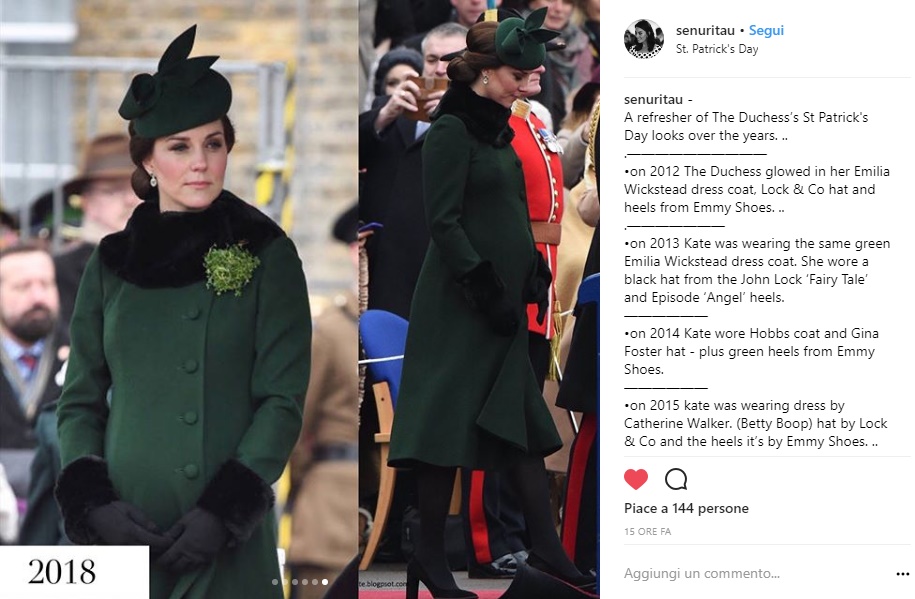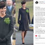 Nel 2017, dopo un anno di pausa, Kate è tornata a festeggiare San Patrizio con un elegantissimo cappottino firmato Catherine Walker e cappellino Sylvia Fletcher per Lock & co.