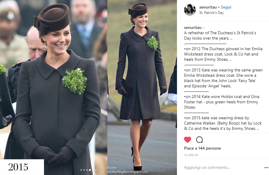 Cambio di cappotto (ma non di colore) nel 2014, quando Kate ha partecipato al Saint Patrick’s Day con un cappottino Hobbs e cintura pitonata. Scarpe verdi e cappello Gina Foster, anch’esso verde, completavano il look.