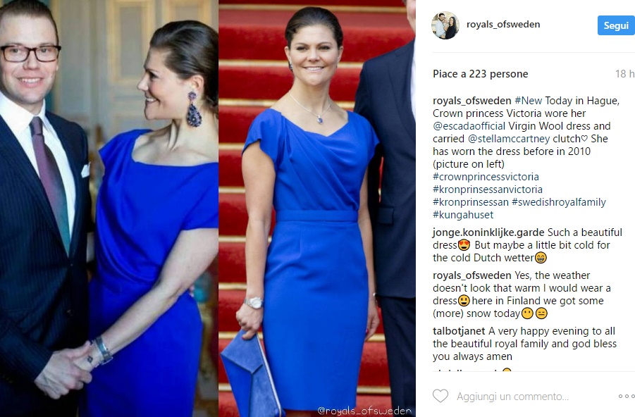 Sia Kate che Victoria sono due donne molto eleganti e considerate icone di moda. Kate è copiatissima dalle ragazze più giovani mentre Victoria è un punto di riferimento per le donne più mature. Nelle ore scorse Victoria di Svezia ha sfoggiato un elegantissimo abitino blu elettrico firmato Escada. Anche Kate Middleton spesso ha sfoggiato, in occasione di eventi e uscite pubbliche, tubini sul blu elettrico. Dopotutto si tratta di un colore molto chic e che si presta bene a look formali pur regalando alla mise un tocco moderno di glamour.