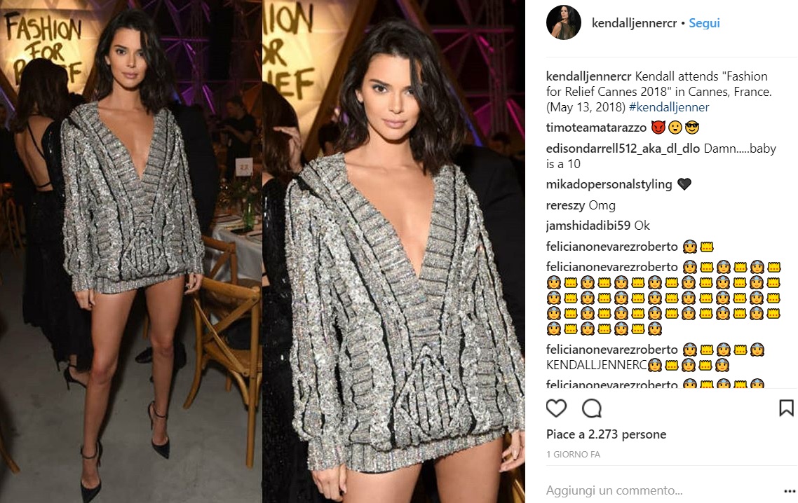 La modella ha scelto di partecipare all’evento con un maxi maglione super scollato e con una cascata di paillettes, una creazione dello stilista Nicolas Jebran, abbinato a delle scarpe con tacco a stiletto. Ma c’è un dettaglio che non è passato inosservato: Kendall ha indossato il maglione come un abito cortissimo e… senza i pantaloni!