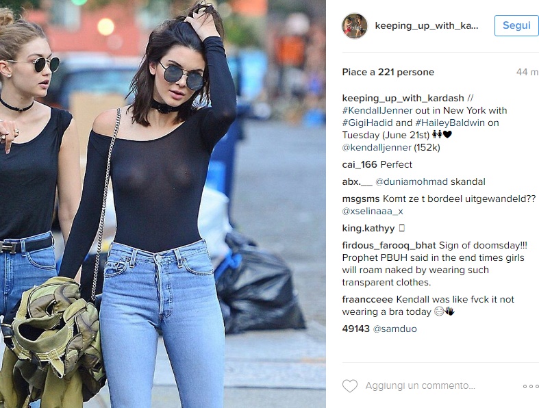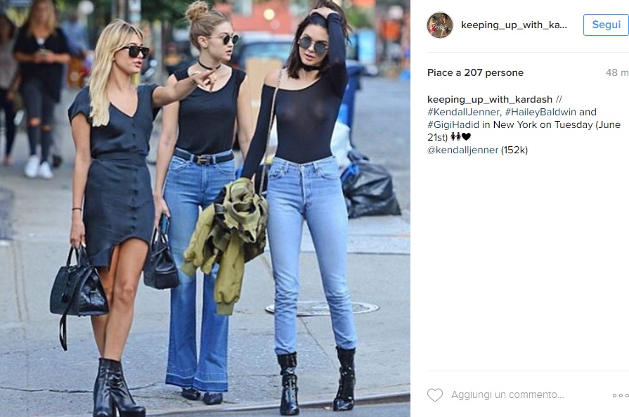 NEW YORK – Kendall Jenner eccessiva? Look vedo non vedo… FOTO. Che le sorelle Jenner e le sorellastre Kardashian non si facciano problemi a mostrare troppo è cosa nota. Così, non sembra nemmeno troppo singolare che la nostra cara Kendall Jenner abbia osato un look… vedo non vedo a dir poco audace. Per le strade di Soho, a New York, insieme alle care amiche Gigi Hadid e Hailey Baldwin, la sorellastra di Kim Kardashian è stata paparazzata con un look che ha fatto, come al solito, scalpore: jeans Re/Done, borsa Givenchy e… top nero a dir poco aderente e… trasparente. Inevitabile che i fotografi non cogliessero la ghiotta occasione di paparazzare Kendall Jenner.