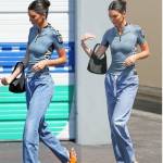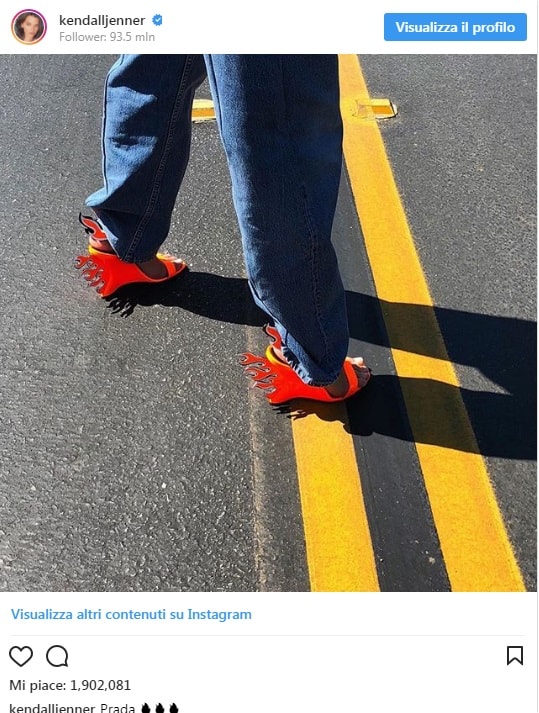 La modella più pagata al mondo li ha mostrati con orgoglio su Instagram. Se guardiamo il nostro telefonino, come mostrano le immagini in fondo all’articolo, ci accorgiamo che questi sandali con la zeppa ricordano l’emoji “flame” sia nella forma, sia nei colori. Kenny ci ha abbinato un top azzurro Adidas e dei jeans baggy. Per concludere in bellezza, la sorellastra di Kim ha con se una minuscola borsa in tessuto nero sempre Prada.