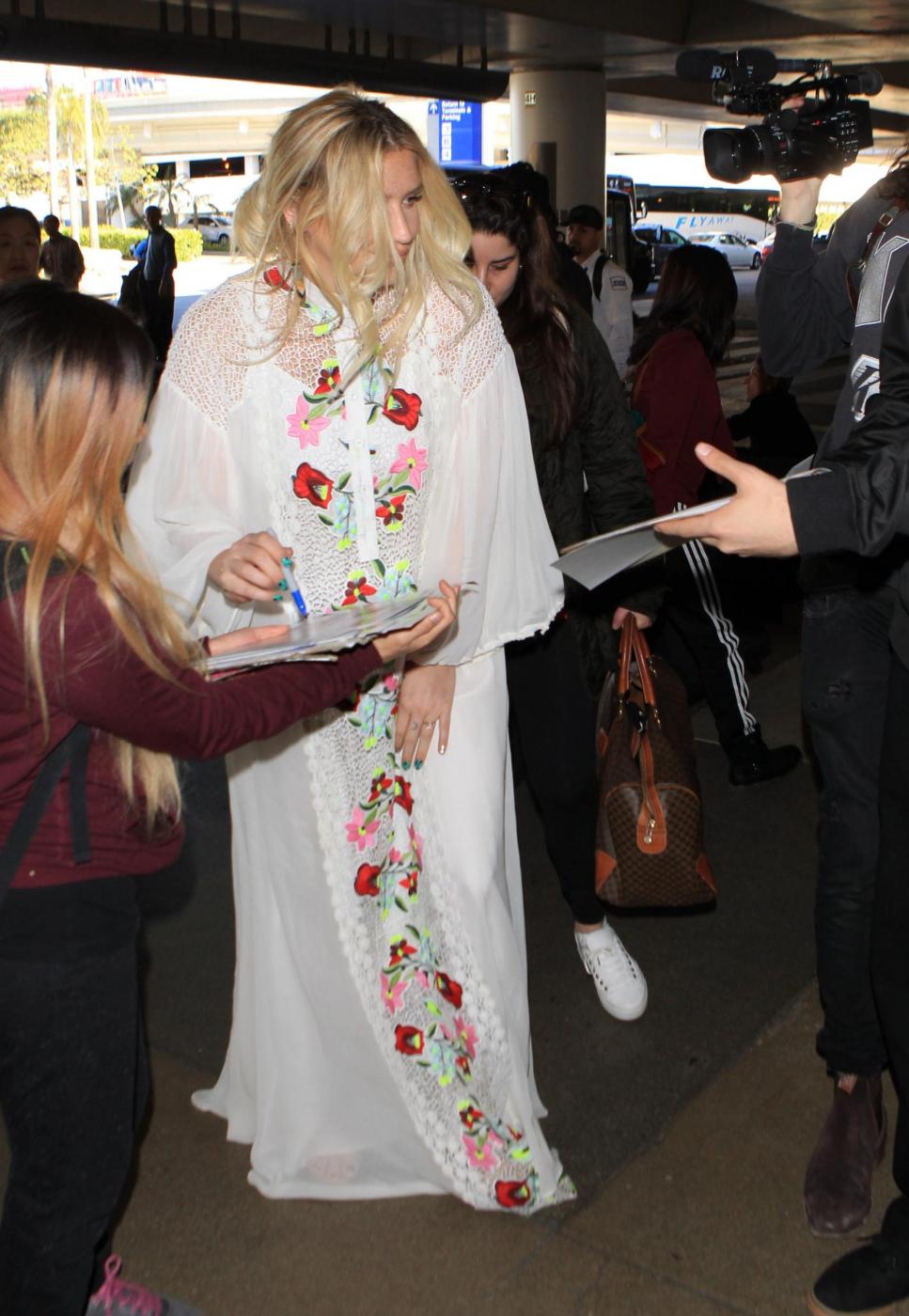 LOS ANGELES – Kesha firma autografi in aeroporto indossando una lunga tunica bianca. La cantante è stata paparazzata così all’aeroporto di Los Angeles ed ha rischiato di perdere l’aereo su cui doveva viaggiare a causa di un sacchetto sospetto rivelatosi poi un falso allarme, che ha richiesto l’intervento degli artificieri.