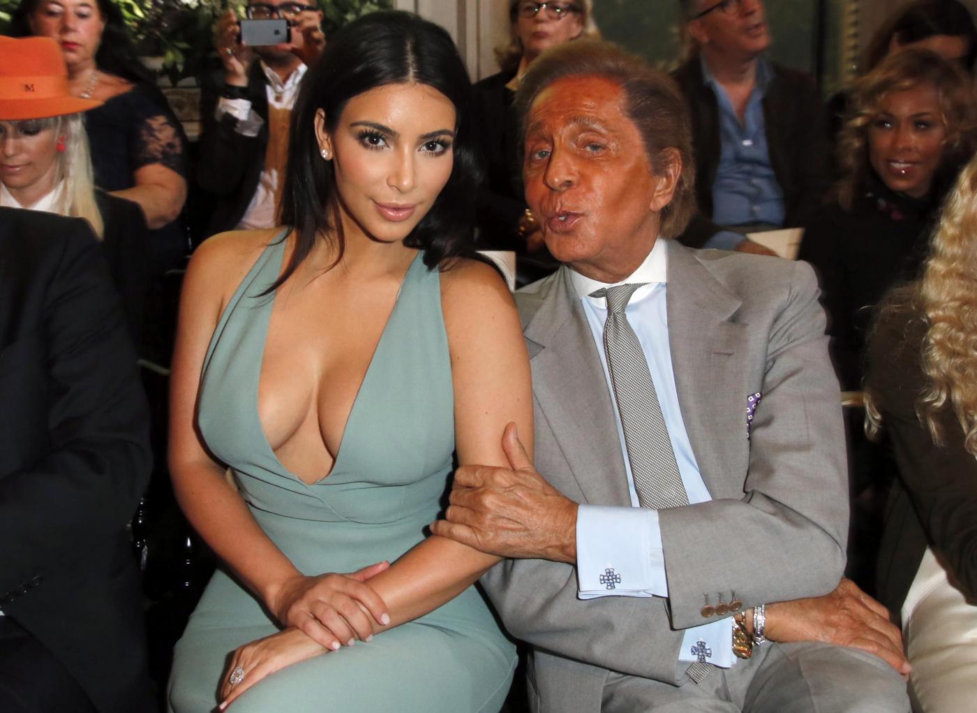 Kim Kardashian and fashion designer Valentino pose for photographers prior to the presentation of the Valentino Fall Winter 2014-15 Haute Couture fashion collection designed by Italian creative directors Maria Grazia Chiuri and Pierpaolo Piccioli, in Paris, Wednesday, July 9, 2014. (AP Photo/Francois Mori)