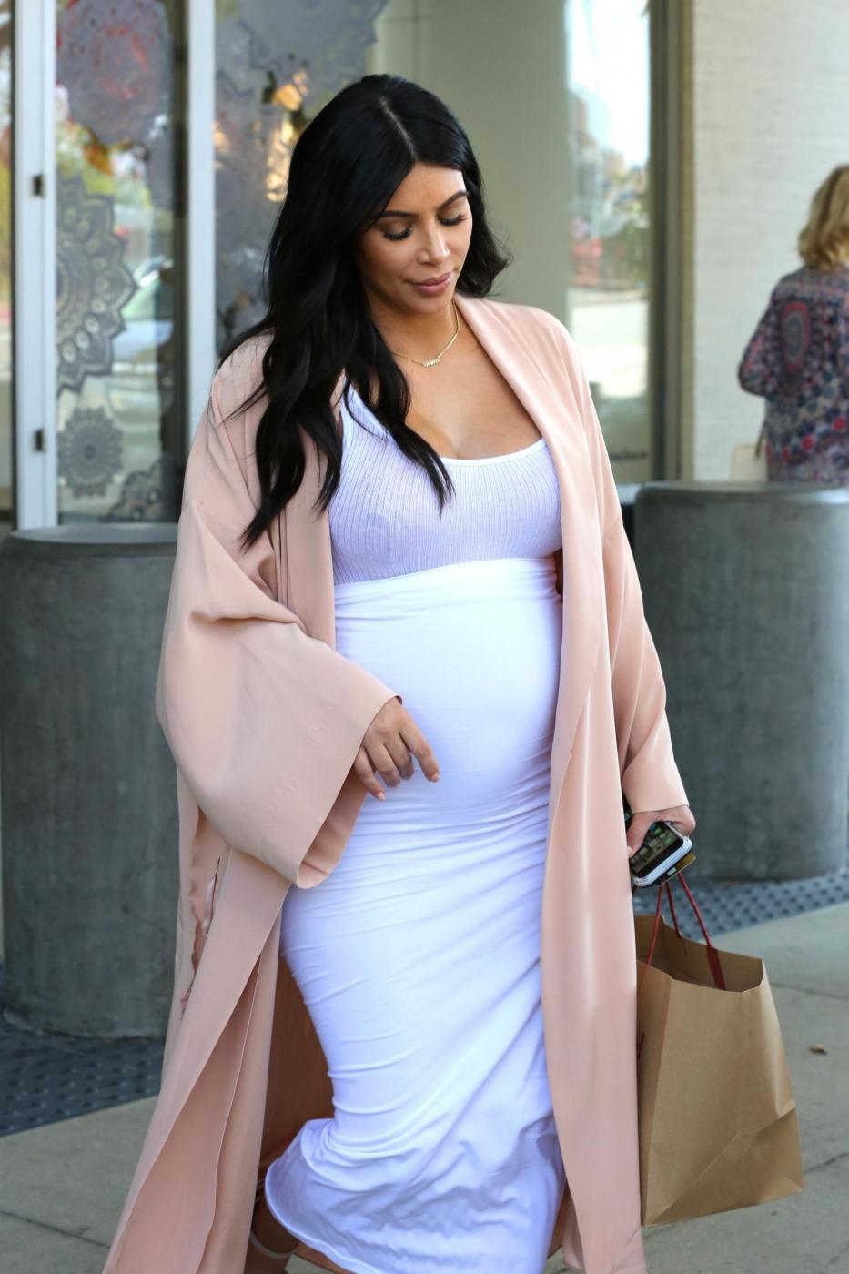 Kim Kardashian si tiene il suo pancione all'aereoporto Kim Kardashian holds her growing baby bump Kim Kardashian arrives at LAX in looking a tad uncomfortable holding her belly in a skintight white dress that displayed her growing bump and strappy beige high heels. She spent the night before masquerading around New Orleans in all-black but arrived back in LA and has not taken a break during her pregnancy. Perez/X17online.com LaPresse -- Only Italy
