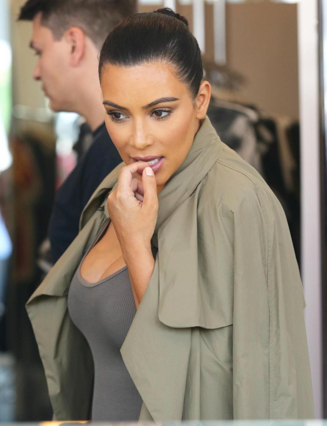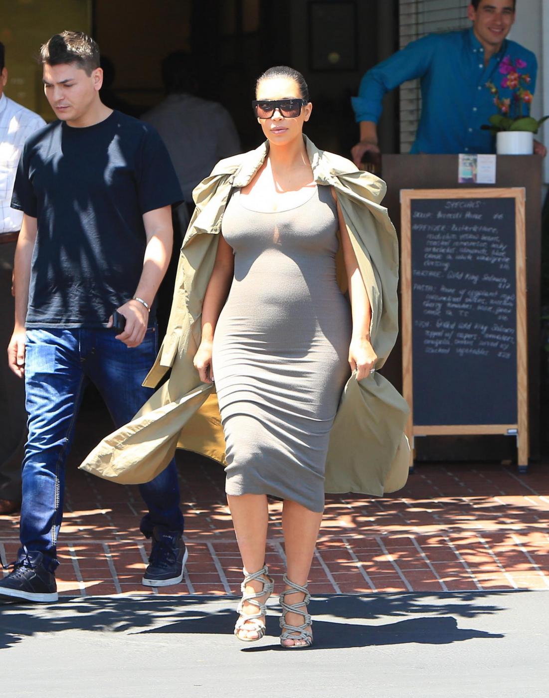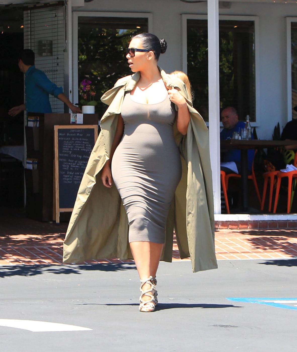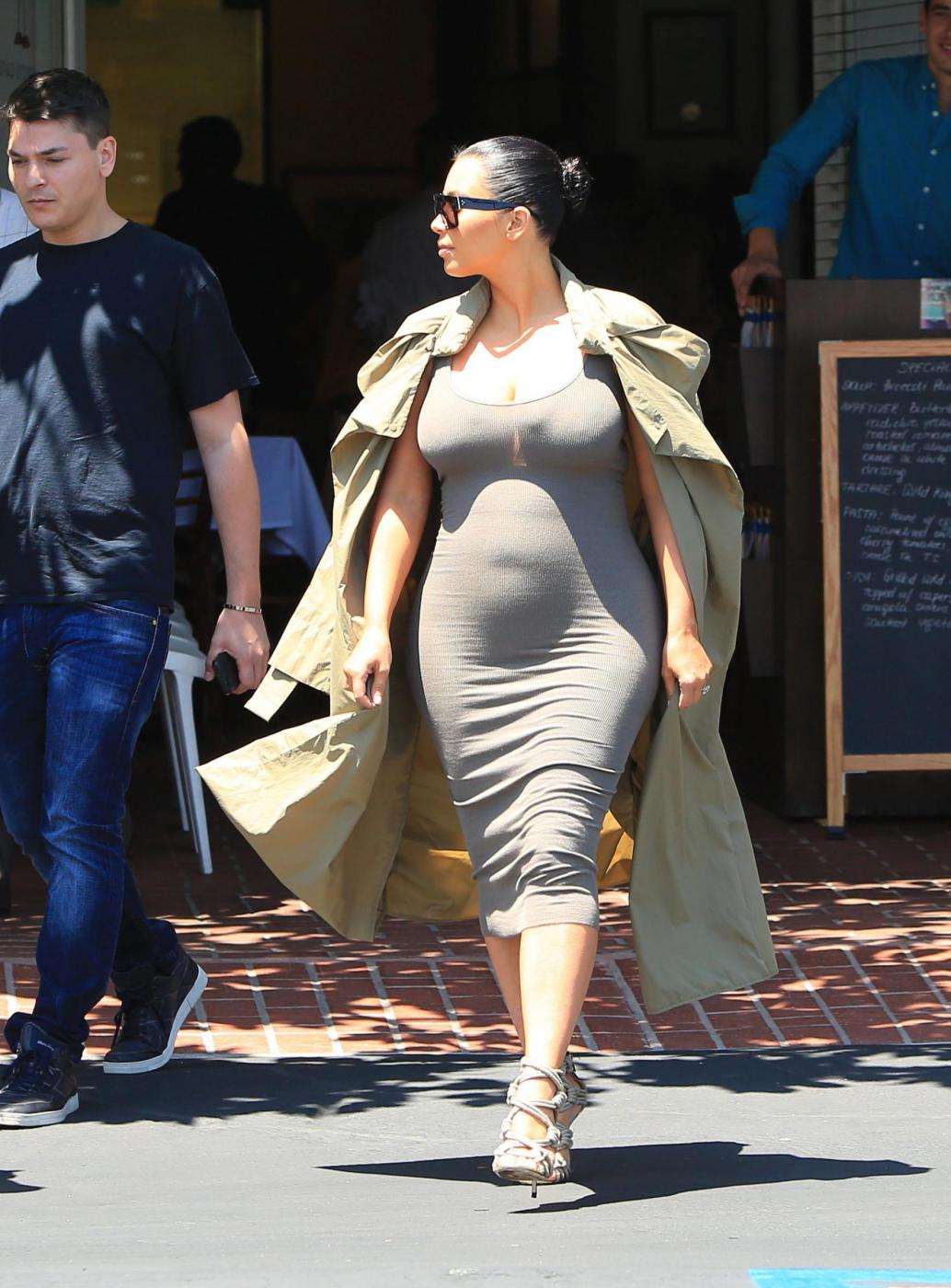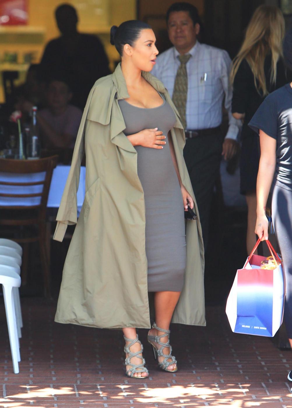 West Hollywood Kim Kardashian squeezes her growing baby bump into a tight, ribbed dress and covers up with a long trench during an outing to Fred Segal and then a couple other shops in West Hollywood. Thursday, July 16, 2015 X17online.com Lapresse Only italyKim Kardashian con pancione bene in vista fa shopping a Melrose