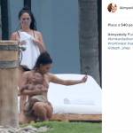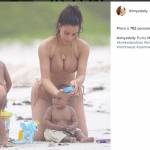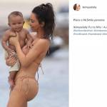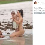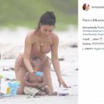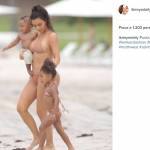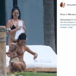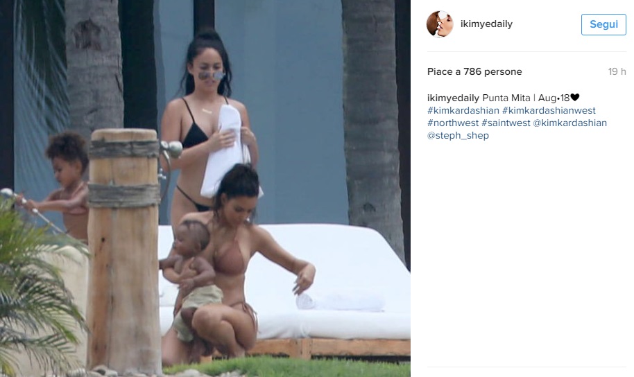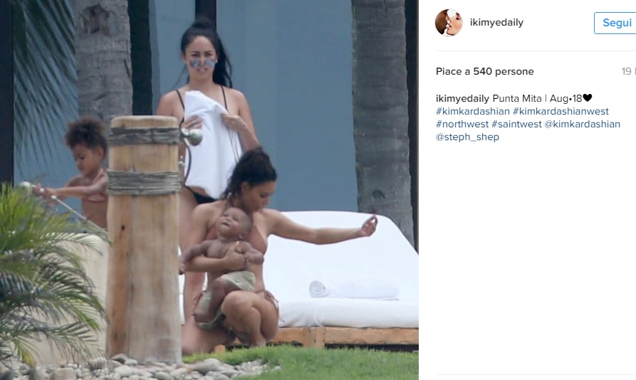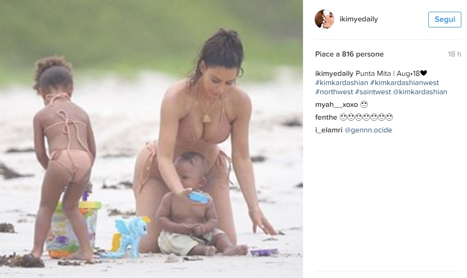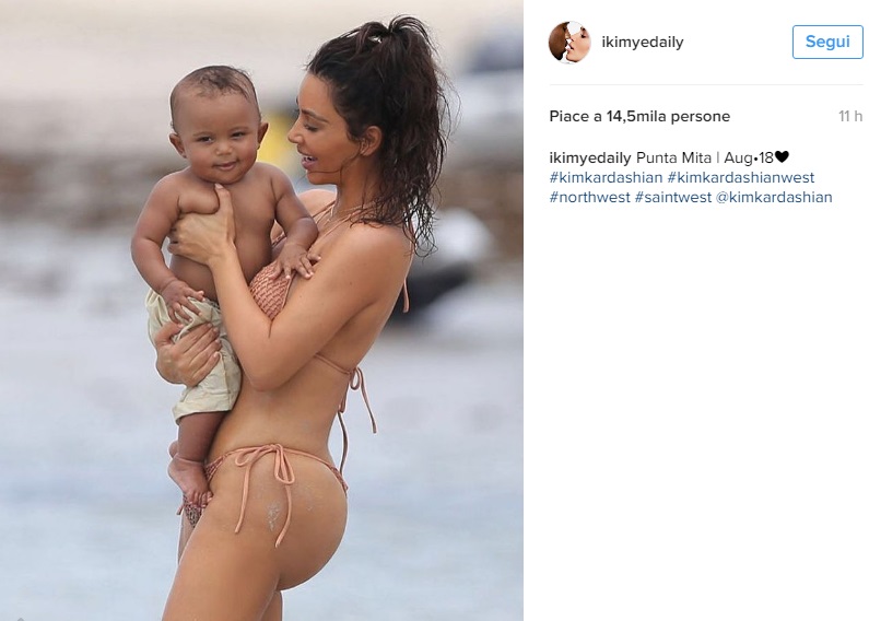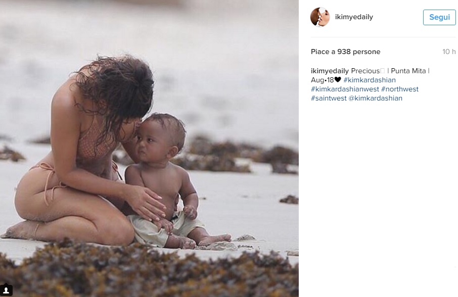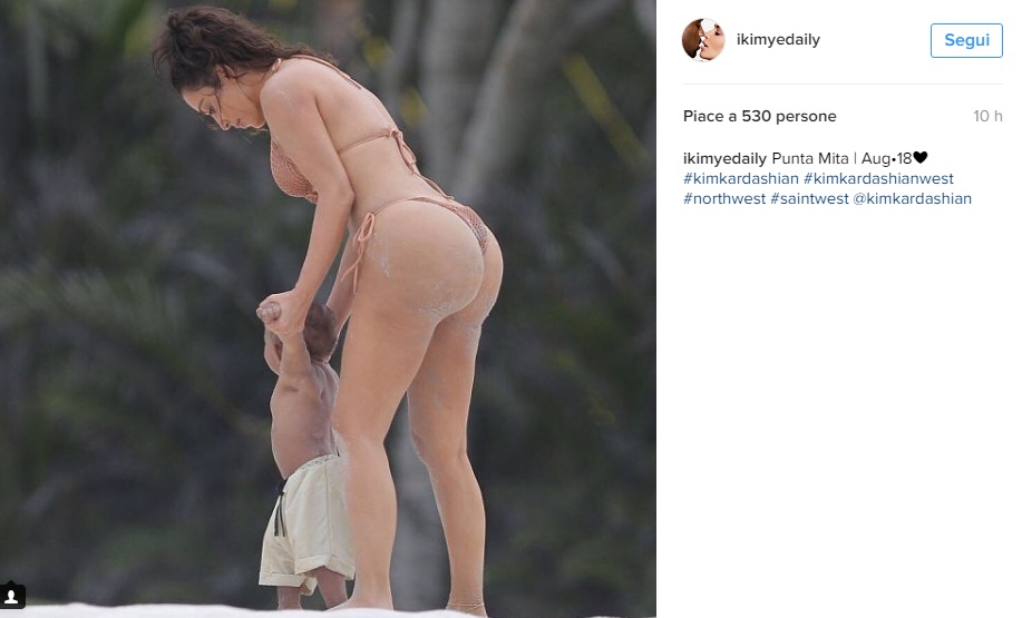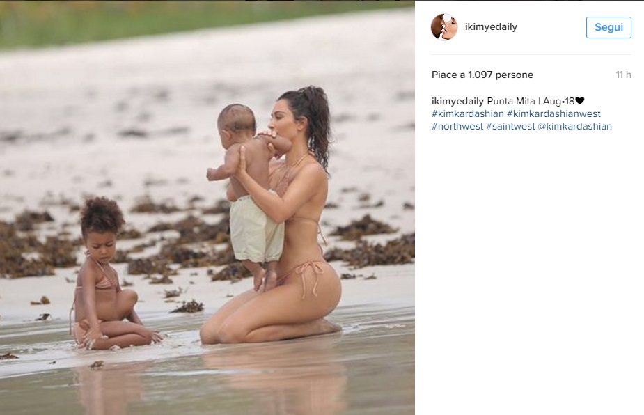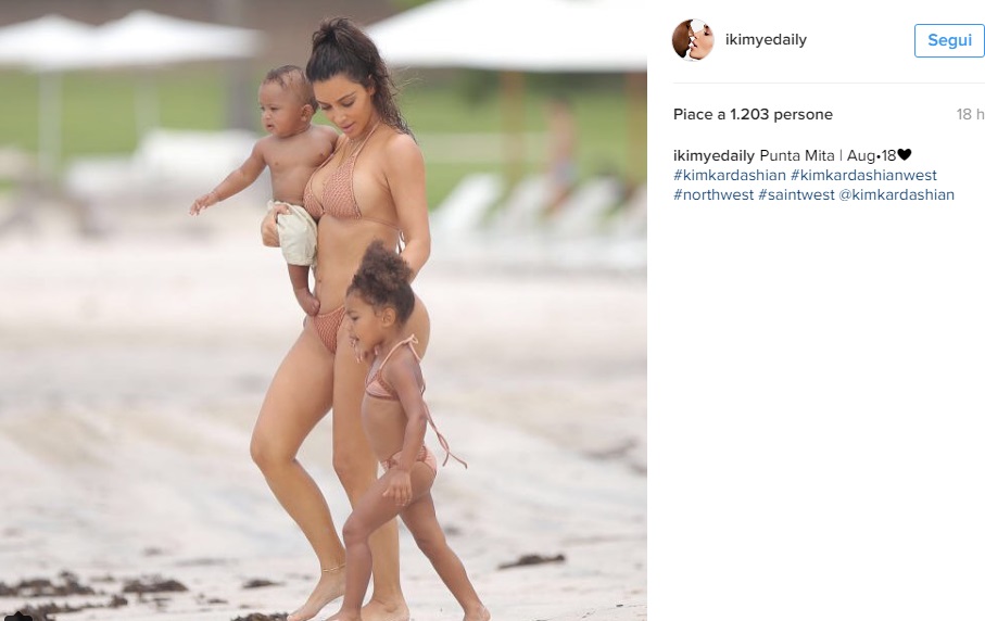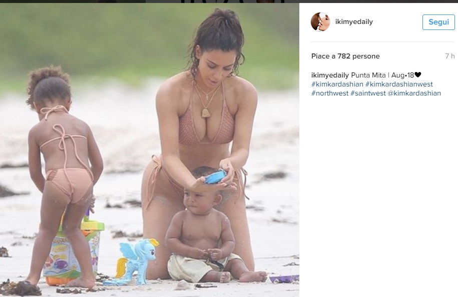 Nord indossa un bikini in tinta con la madre, creato come per la madre da Acacia Swimwear (quello di Kim, scrive il Daily Mail, costa circa 107 euro). Mamma e figli si divertono a giocare con i castelli di sabbia. Kenye West è probabilmente il fotografo di famiglia, dato che le foto sono state pubblicate sul suo profilo Instagram).