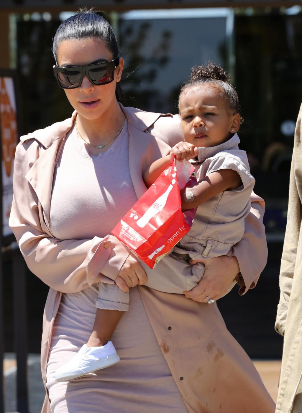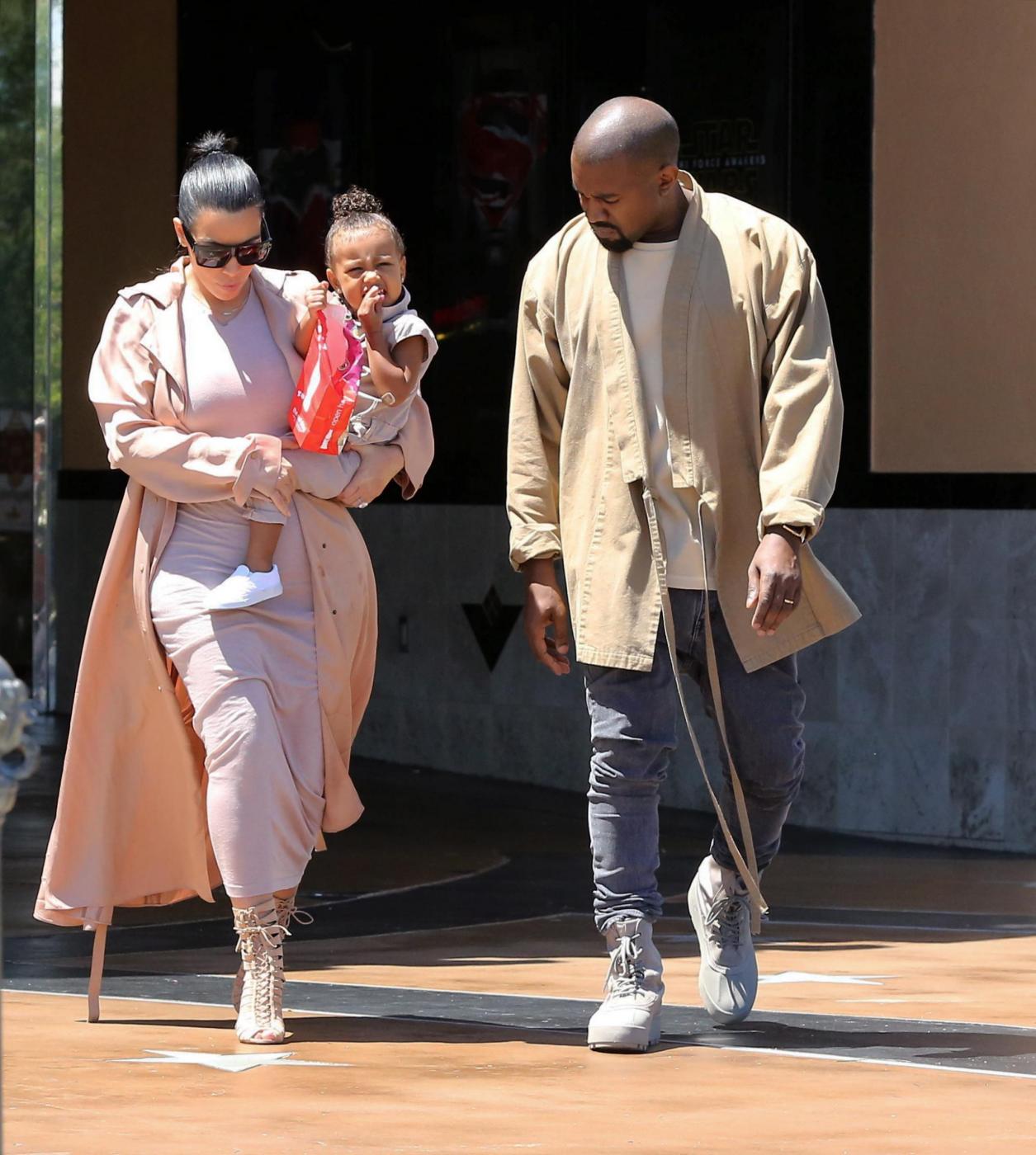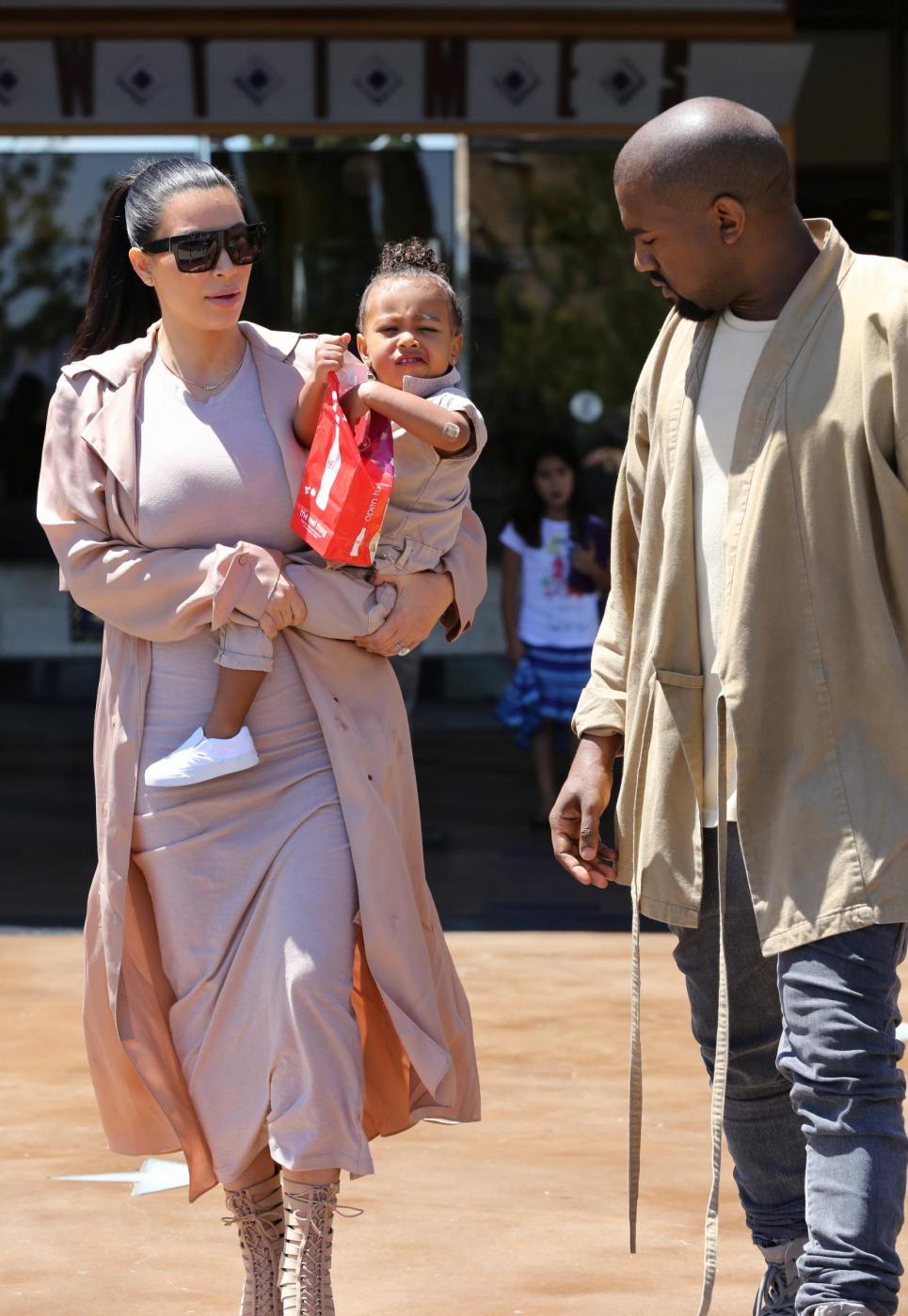 Kim Kardashian e Kanye West con la figlia NoriExpecting parents Kim Kardashian and Kanye West take adorable daughter Nori (who loves popcorn) to the movies to see Inside Out and shopping in Calabasas, CA. The trio wears matching shades of peach and beige. Pregnant Kim appears a little bit irritable. And Kanye tries to match Kim's high heels with his own platform hi-tops. X17online.comLaPresse -- Only Italy