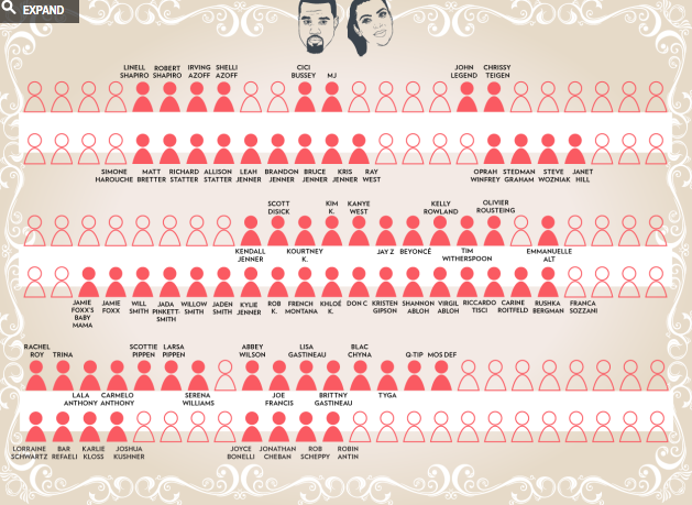 A Firenze, al Forte Belvedere affittato per l’occasione, i preparativi imponenti vanno avanti da giorni. Ma come verrano attovagliati i gentili ospiti? Il sito americano Jezebel soddisfa anche questa curiosità, con tanto di schemino sul probabile “tableau de mariage”. Kim e Kanye saranno circondati dalle numerose famiglie (soprattutto quella di lei) e da amici Vip: Beyoncé e Jay Z, tanto per dirne due. E un posto è riservato anche a un’italiana: si tratta di Franca Sozzani, direttore di Vogue Italia.