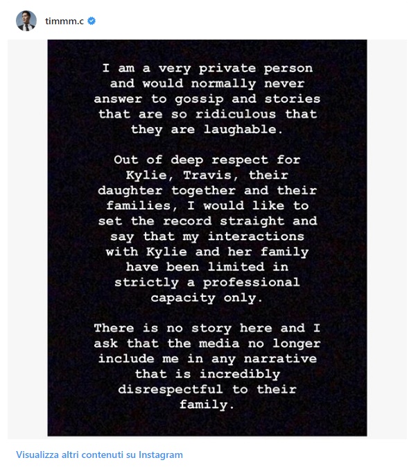 Adesso, dopo il polverone più o meno ironico che si è alazato, a voler mettere i puntini sulle i è lo stesso Tim, che ha voluto spiegare personalmente com’è il suo rapporto con Kylie Jenner sia di profondo rispetto. Ecco cosa ha scritto su Instagram: “Sono una persona riservata e normalmente non avrei mai risposto a delle storie così ridicole. Ho un profondo rispetto per Kylie, Travis, la loro figlia e le loro famiglie. Ma i miei rapporti con loro sono strettamente professionali”.