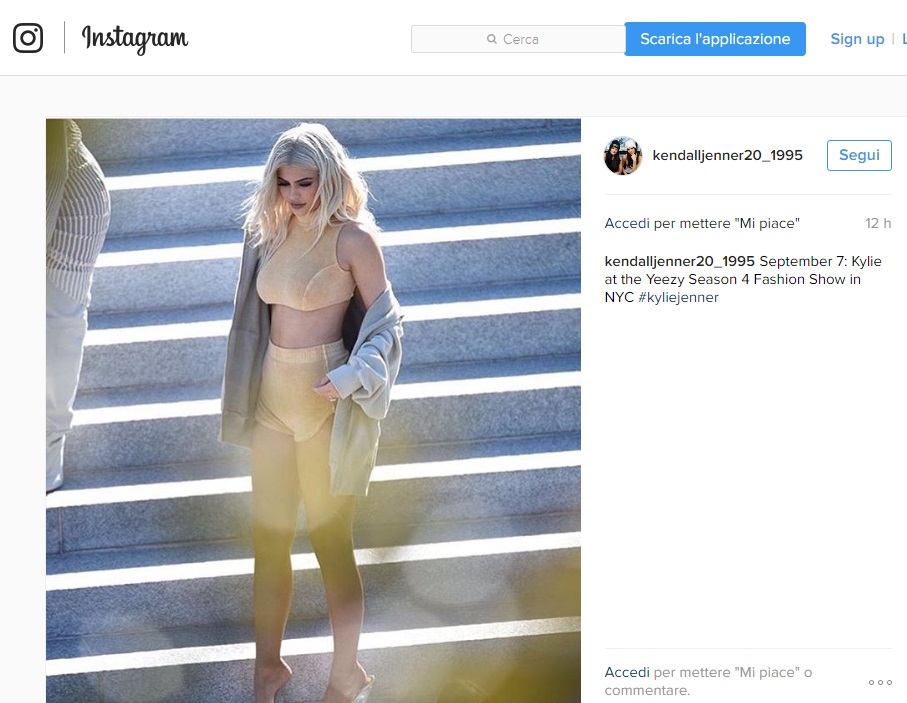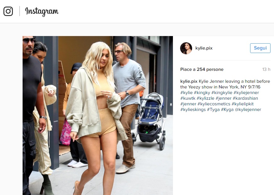 Kylie era presente alla sfilata del marchio Yeezy che suo cognato Kanye West ha organizzato in occasione della New York Fashion Week. Nelle foto pubblicate su Instagram, si vede Kylie che lascia il suo albergo per recarsi alla sfilata. La Jenner è in compagnia della sorella Kendall e indossa un top della Yeezy color camoscio con degli shorts e una felpa con zip aperta dello stesso colore.