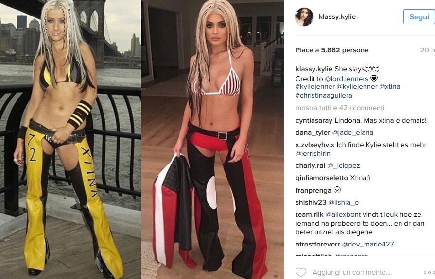 Kylie Jenner, vera e propria regina delle provocazioni dei giorni nostri, ha pensato bene di rappresentare proprio quella Christina Aguilera discussa e provocante del 2002 con una maschera riuscita alla perfezione. Dopotutto, che Kylie Jenner e sorelle siano spesso al centro di gossip per via dei loro look eccessivi e provocanti è cosa nota.