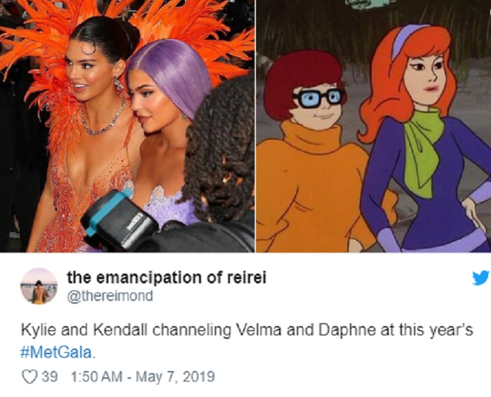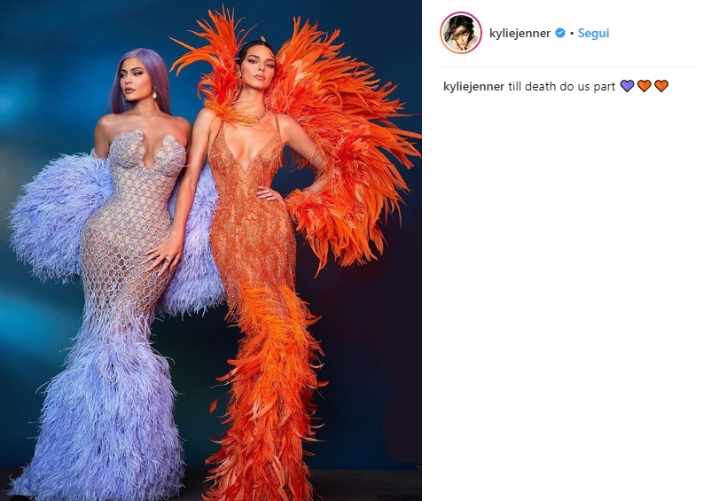 Non è molto frequente vederle sfilare insieme (alla serata c’erano anche Travis Scott e l’altra sorella Kim Kardashian con marito ndr): in questa occasione, però, le due sorelle sono apparse unite più che mai ed hanno deciso di optare per questi due abiti giudicati però un po’ sottotono da alcuni osservatori. Kendall ha indossato un abito di piume arancione, brillante ed ispirato a Cher. La sorella Kylie ha invece optato per un abito a piume color lavanda abbinaro ad una parrucca dello stesso colore.