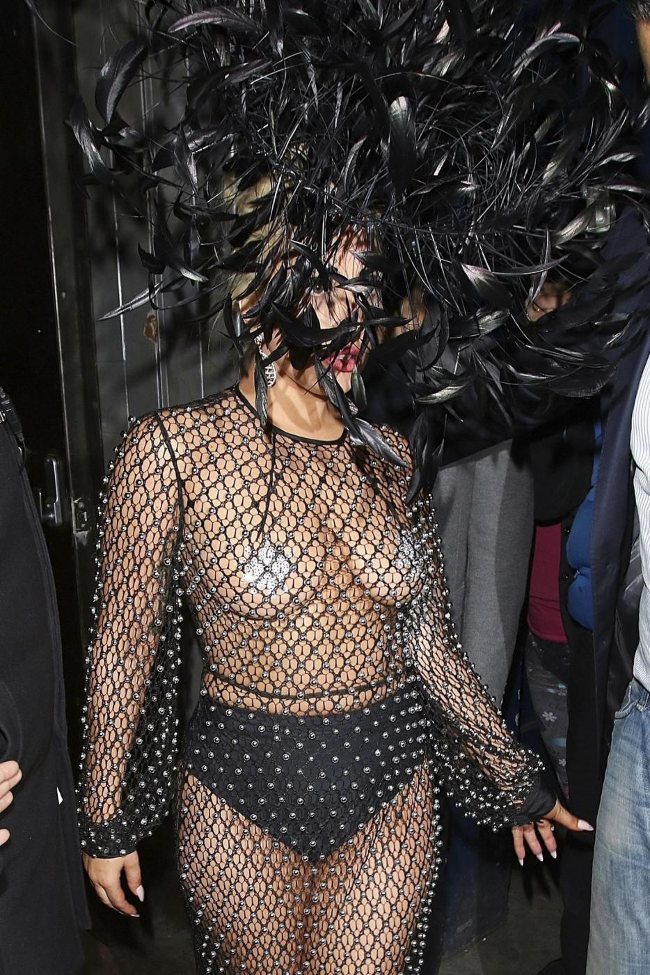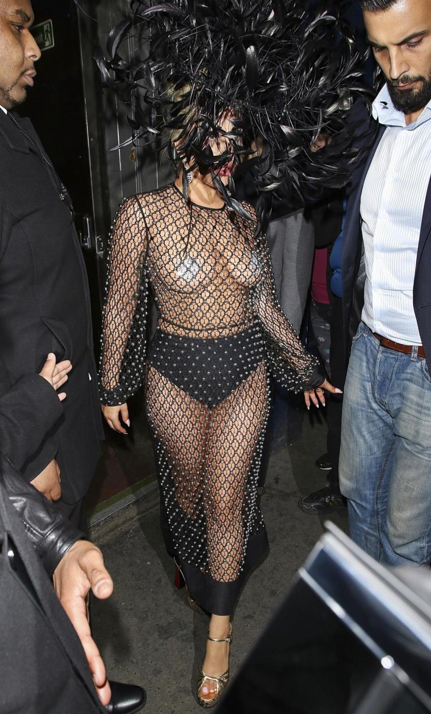 June 09, 2015Eccentric singer Lady Gaga arrives at The Box in London wearing a black feather headdress, chainmail dress and silver nipple pasties.FameFlynet UK/LaPresseOnly Italy