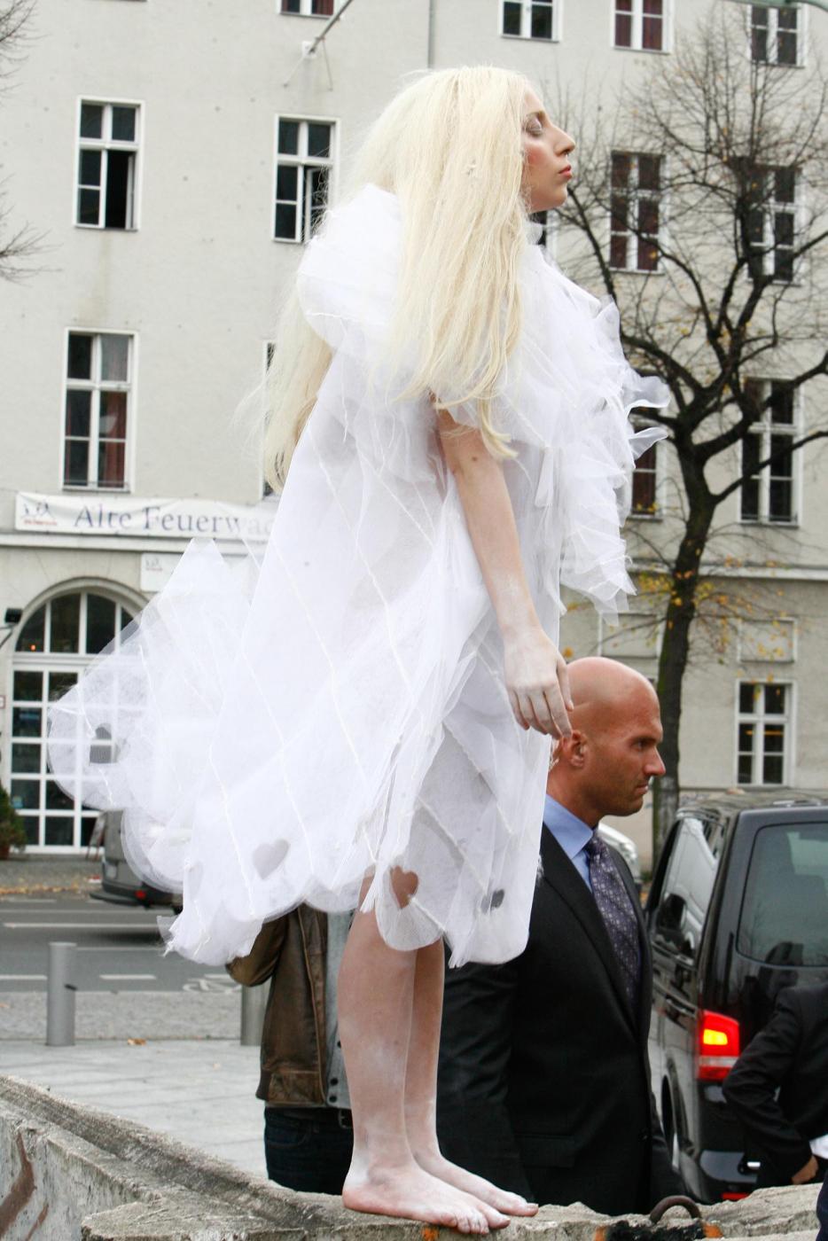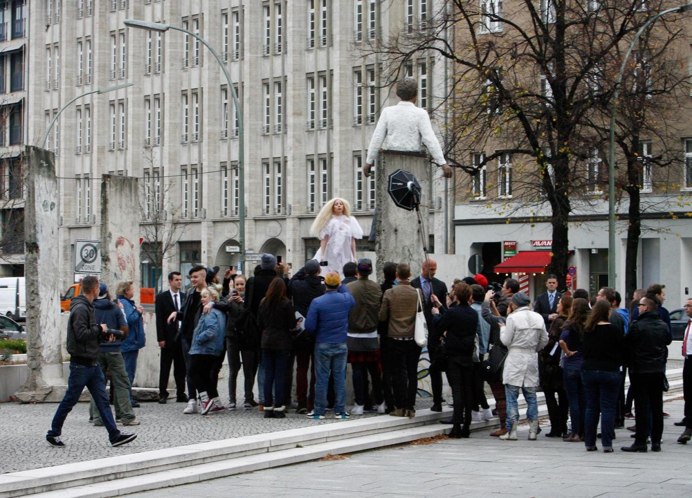 NO GERMAN NEWSPAPERS.October 25, 2013: Lady Gaga goes barefoot and wears a sheer dress with no bra as she climbs a wall and salutes a statue in Berlin, Germany.Mandatory Credit: Meyer Fotos/INFphoto.com Ref: infgebe-05|sp|Lapresse Only italy
