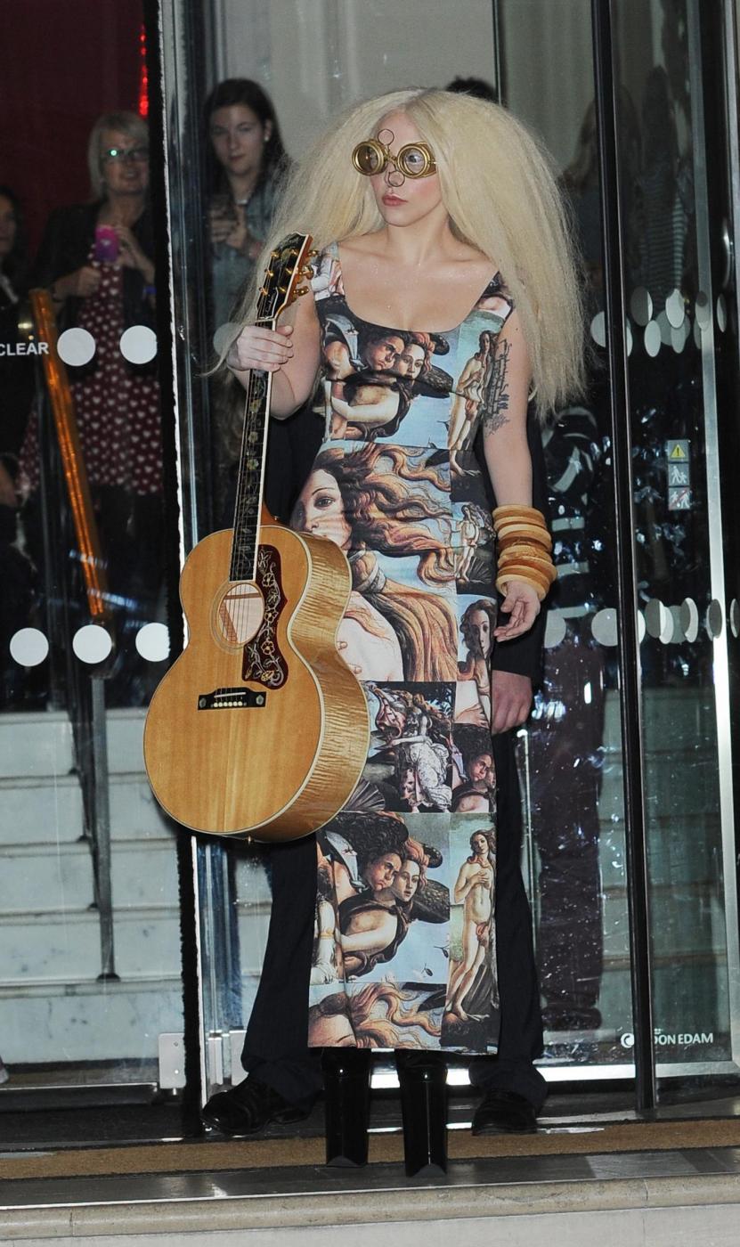 October 26, 2013: Lady Gaga leaves her hotel wearing a Botticelli painting printed dress and carrying an acoustic guitar as she heads to a recording studio, London, UK.Mandatory Credit: INFphoto.com Ref: infuklo-146|sp| LaPresseOnly Italy