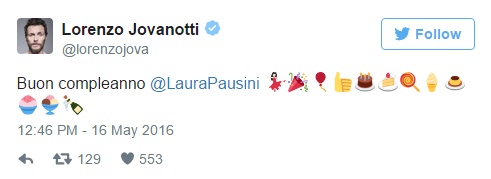 Laura Pausini è un’artista veramente speciale, amatissima da tutti. Così, oltre alla sorpresa arrivata dai suoi amici-colleghi del tour, anche il mondo dello spettacolo ha voluto farle gli auguri. Su Twitter, infatti, alcuni tra i suoi più cari amici e colleghi le hanno dedicato un pensiero, da Jovanotti che la riempie di emoticon a Giuliano Sangiorgi, cantante dei Negramaro e autore, per lei, di “Sono solo nuvole” contenuto nell’ultimo album della cantante “Simili”. Il cantante salentino ha scritto: