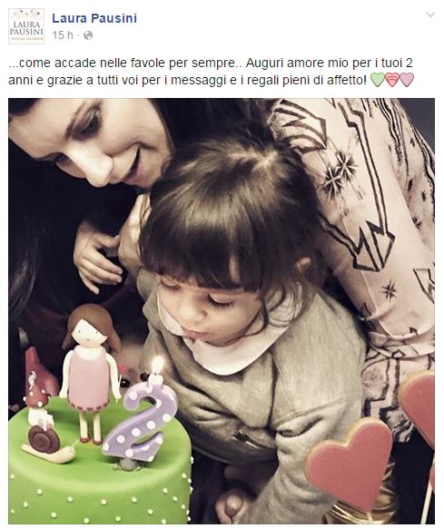 MILANO – Laura Pausini, prima foto con la figlia Paola. «La nostra Paola oggi alle 15.55 compie 2 anni. E siamo felici tutti come mai nella vita», queste le parole della cantante su Facebook. La Pausini ha voluto condividere la felicità dell’evento con i fan che hanno iniziato a farle gli auguri già di primo mattino: «Grazie a tutti voi per il vostro affetto», ha scritto sul social network. Laura è diventata mamma l’8 febbraio 2013. La bimba è nata dalla relazione con il compagno Paolo Carta, dal 2005 chitarrista della stessa Pausini.