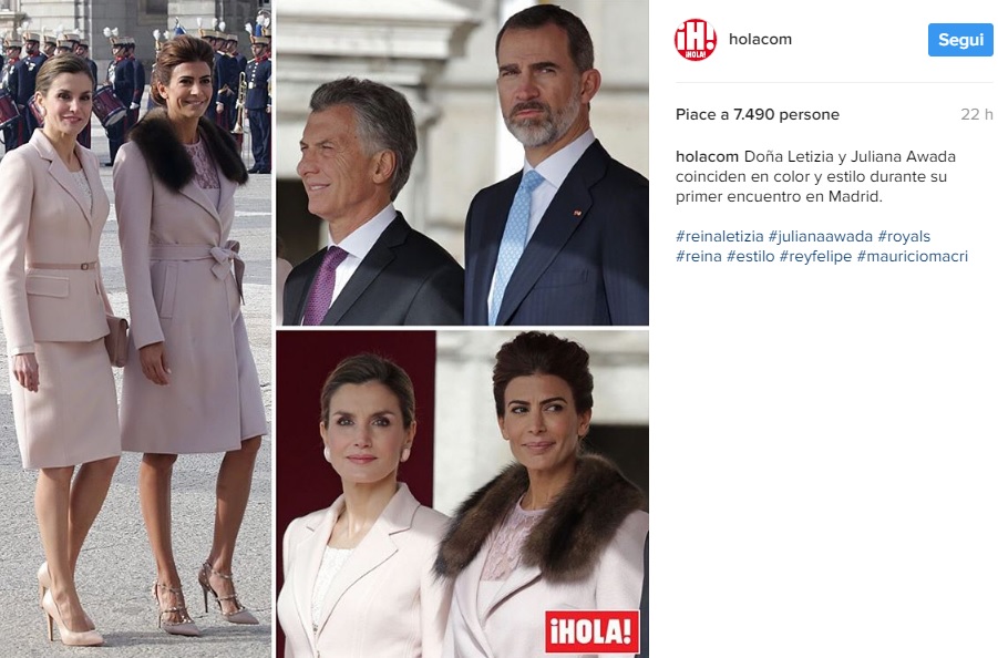 MADRID – Letizia Ortiz e Juliana Awada: look a confronto. La regina di Spagna e il re Filippo VI hanno accolto a Madrid il presidente dell’Argentina Mauricio Macri e la bellissima moglie. Le due first lady hanno scelto outfit oltremodo eleganti e…in sintonia. Entrambe hanno optato per outfit color cipria. Capelli rigorosamente raccolti e ai piedi gli immancabili tacchi. Letizia Ortiz è ormai un’icona di stile ed eleganza. I suoi look sono sempre impeccabili. Mai banali, mai scontati, sempre capaci di mettere in risalto la sua regale bellezza. L’ex giornalista ha rinunciato alla sua brillante carriera per portare avanti i suoi impegni istituzionali. In questi ultimi anni è sempre più vicina al suo popolo, che non di rado l’ha criticata per essere troppo poco presente accanto al marito nelle sue uscite in pubblico.