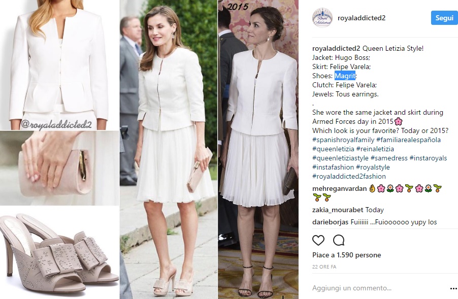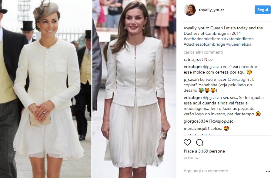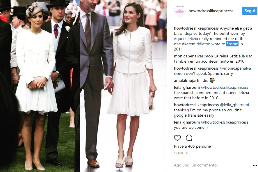 ROMA – Letizia Ortiz e Kate Middleton in bianco: look a confronto FOTO. Nelle scorse ore Letizia Ortiz regina di Spagna ha catalizzato l’attenzione dei fotografi con un completo bianco incredibilmente chic. In occasione di una uscita pubblica a Madrid insieme al marito, il re Filippo di Spagna, Letizia Ortiz ha sfoggiato un look total white fashion ed elegante composto da una gonna voluminosa a pieghe firmata Felipe Varela e giacca Hugo Boss. Scarpe e clutch color cipria completavano la mise. Guardando bene le foto, però, agli esperti delle famiglie reali non è passato inosservato un particolare: il look di Letizia Ortiz ricordava moltissimo un’altro look scelto qualche tempo da Kate Middleton. Era giugno 2011, la Duchessa era da poco diventata moglie del principe William e in occasione dell’Epsom era apparsa con un bellissimo look total white che ricorda moltissimo quello scelto da Letizia Ortiz nelle scorse ore.