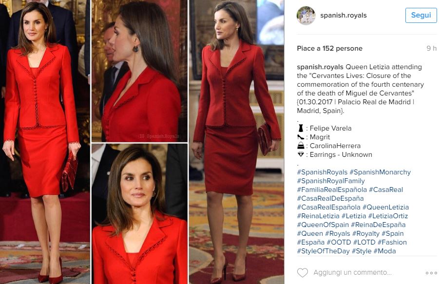Letizia Ortiz impeccabile con un tailleur rosso. La regina di Spagna ha preso parte a un evento organizzato per celebrare Miguel de Cervantes, universalmente noto per essere l’autore del romanzo Don Chisciotte della Mancia, uno dei capolavori della letteratura mondiale di ogni tempo. Ancora una volta la moglie di Filippo VI ha optato per il colore rosso, che si conferma una delle sue tinte preferite. Letizia Ortiz è ormai considerata un’icona di stile e bellezza. Merito anche dei suoi outfit, capaci di mettere in risalto la sua bellezza. Una svolta fashion arrivata in questi ultimi anni, considerando che fino a poco tempo fa non era solita mostrarsi in pubblico così spesso come invece sta facendo ultimamente.