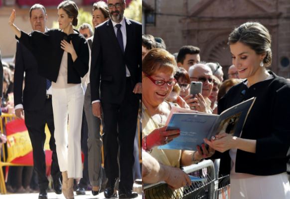 Letizia Ortiz look: mantellina nera e tacchi. La regina di Spagna, 43 anni, è apparsa impeccabile durante la sua vita a Villanueva de los Infantes, comune spagnolo di 5.373 abitanti situato nella comunità autonoma di Castiglia-La Mancia. Per l’occasione l’ex giornalista ha scelto un outfit semplice e allo stesso tempo elegante. Pantaloni bianchi, abbinati a scarpe color carne e maglia dello stesso colore. Dettaglio chic: la mantellina nera. Sappiamo invece che dietro la regina di Spagna c’è lo stilista Felipe Varela, stilista spagnolo poco conosciuto in Italia.