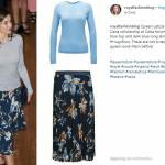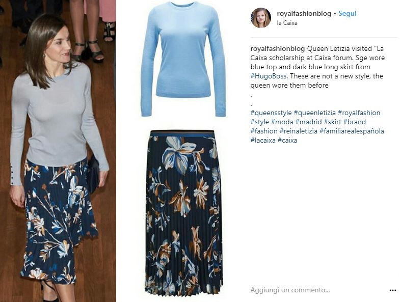 La sovrana spagnola ha inaugurato la stagione di mezzo che precede l’estate con un outfit semplice ed elegante. La moglie di Filippo VI ha indossato una gonna longuette a stampa floreale firmata dalla sua stilista preferita: Carolina Herrera. Il capo era abbinato a una maglia celeste by Hugo Boss e scarpe Magrit.
