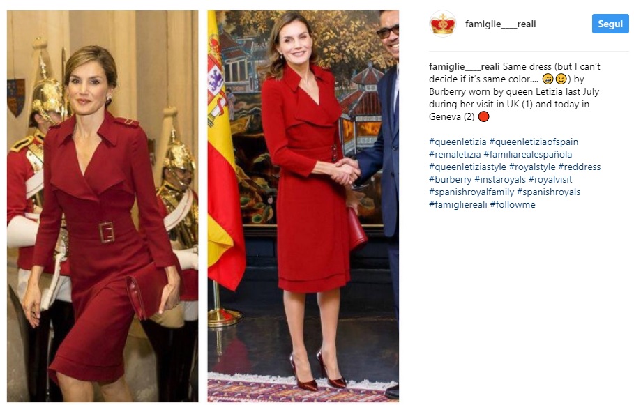 MADRID – Letizia Ortiz più sensuale che mai in rosso Burberry. La regina di Spagna ha indossato un outfit impeccabile per la sua visita della sede dell’Organizzazione mondiale della sanità a Ginevra. La moglie di Felipe VI ha optato per un elegante vestito-giacca, con borsa e scarpe sempre rigorosamente rosse. In realtà, il look dell’ex giornalista è un déjà-vu. La regina ha infatti indossato lo stesso abito anche in un’altra occasione, durante un viaggio nel Regno Unito.