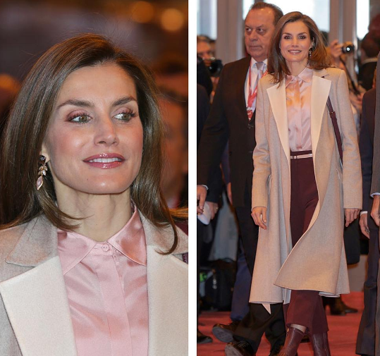 Letizia Ortiz, pantalone bordò e camicia in seta FOTO