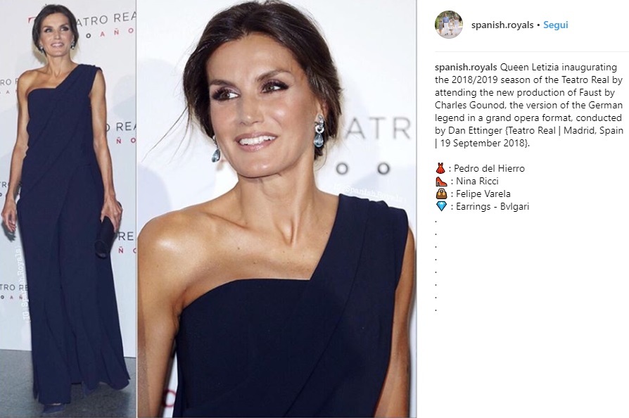 MADRID – Letizia Ortiz sceglie il monospalla: jumpsuits firmata Pedro del Hierro. Eleganza allo stato puro. Così potremmo descrivere l’ultimo outfit della regina di Spagna. Lo scorso mercoledì l’ex giornalista si è concessa una serata all’opera per la prima del Faust. Impeccabile Doña Letizia, che dopo aver indossato un abito della maison Massimo Dutti, è tornata alle sue origini con una tuta blu della marca spagnola. Un modello che metteva in risalto il fisico atletico della regina, senza risultare volgare.