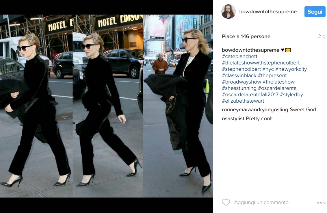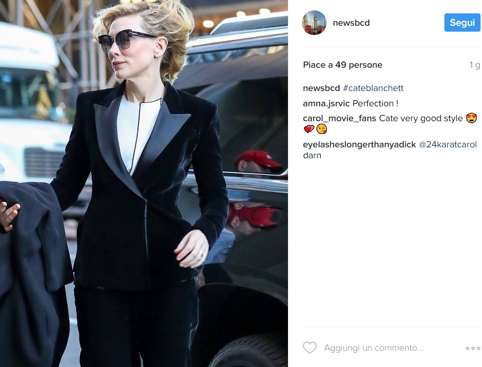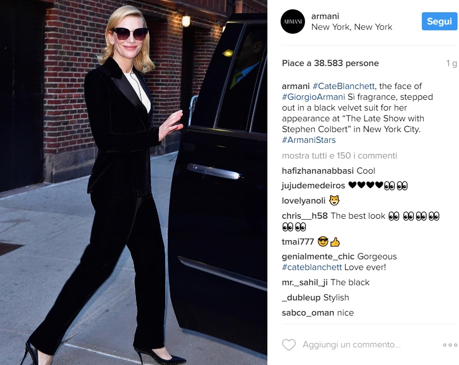ROMA – Look da ufficio perfetto: copia Cate Blanchett in Armani FOTO. Impeccabile l’attrice Cate Blanchett che, in occasione dell’intervista durante il “The Late Show with Stephen Colbert” ha sfoggiato una mise glamour, elegante e incredibilmente chic. Cate Blanchett ha scelto un completo giacca e pantaloni firmato Giorgio Armani. Un abito dallo stile classico confezionato con una maestria sartoriale unica, come solo Giorgio Armani riesce a fare. Il completo nero, reso glamour e attuale dal velluto, calzava alla perfezione a Cate Blanchett che, come sappiamo, è una grande ammiratrice dei completi dallo stile androgino. Completano il look le decolleté con brillanti firmate Roger Vivier e occhiali Tom Ford.ù È una scelta perfetta per un look da ufficio quando si vuole apparire fashion senza troppi fronzoli. Come sempre, Cate appare incredibilmente sofisticata e chic.
